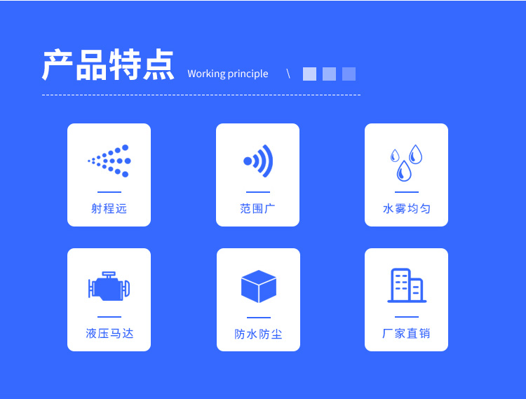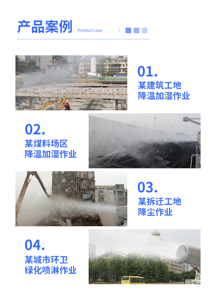 主要用途:用于煤礦場、城市拆遷工地、冶金鋼鐵企業、采礦區域、煤化工企業、水泥廠、火力發電廠、物料和礦產品露天堆放廠、混凝土處理廠、垃圾堆放場、垃圾焚燒廠、沙廠、干式物料倉庫、露天爆破、重度粉塵區域。