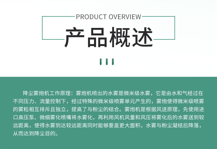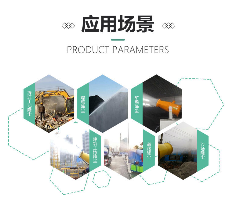 主要用途:建筑工地 煤場,礦場、料場、碼頭工業除塵,農業,園林綠化等飛機場、高速公路、車站、碼頭、公共場所、運動場地、炎熱場地等降塵保濕降溫消毒。