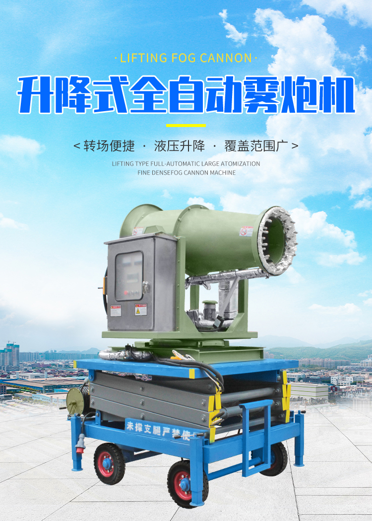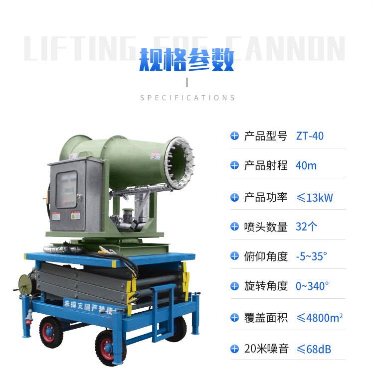 產(chǎn)品特點(diǎn):40米升降式霧炮機(jī)采用液壓升降方式,該款霧炮可在高處作業(yè),使得噴霧范圍更廣泛、更省水,同時(shí)加裝底部拖車(chē),轉(zhuǎn)場(chǎng)方便。