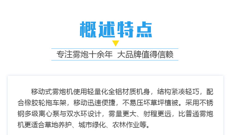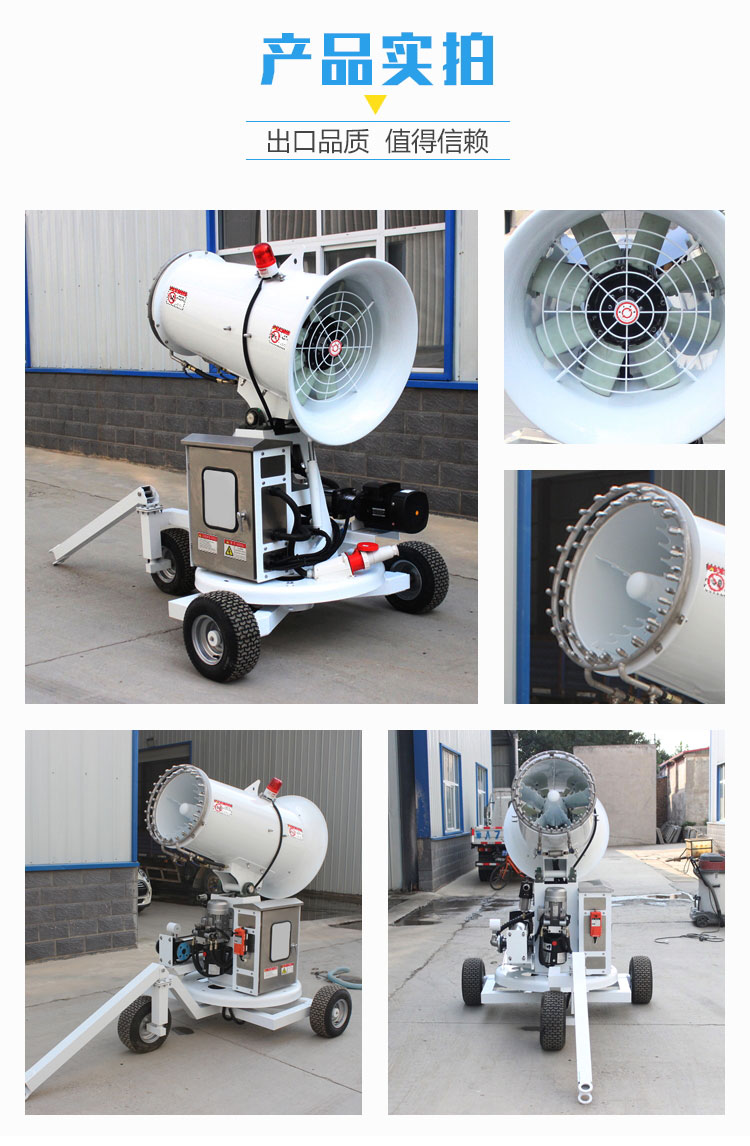 產品特點:50米移動式霧炮機使用輕量化全鋁材質機身,結構緊湊輕巧,大大降低了設備自重,再配合橡膠輪拖車架,移動迅速便捷,不易壓壞草坪、植被。采用不銹鋼多級離心泵與雙水環設計,霧量更大、覆蓋廣泛。