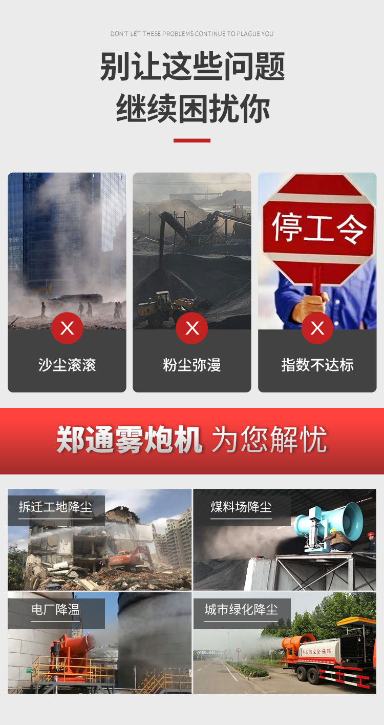 主要用途:用于煤礦場、城市拆遷工地、冶金鋼鐵企業、采礦區域、煤化工企業、水泥廠、火力發電廠、物料和礦產品露天堆放廠、混凝土處理廠、垃圾堆放場、垃圾焚燒廠、沙廠、干式物料倉庫、露天爆破、重度粉塵區域。