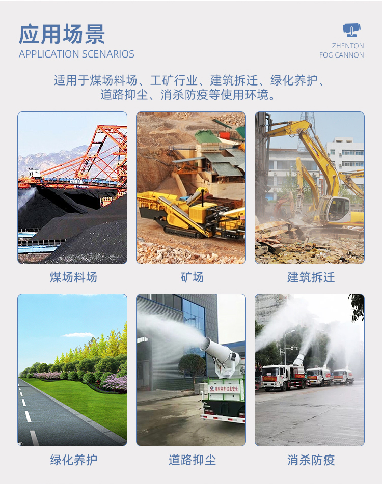 主要用途:建筑工地 煤場,工業除塵,農業,園林綠化等飛機場、高速公路、車站、碼頭、公共場所、運動場地、炎熱場地等降塵保濕降溫消毒。