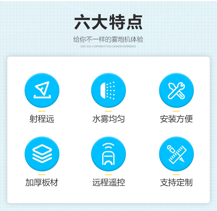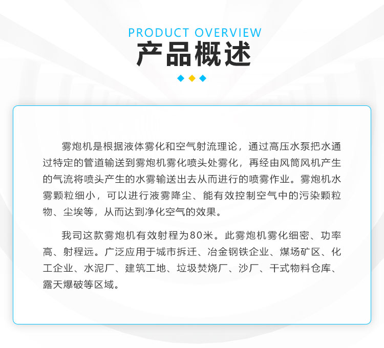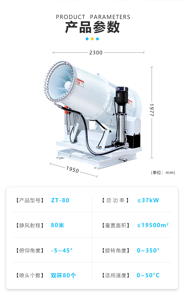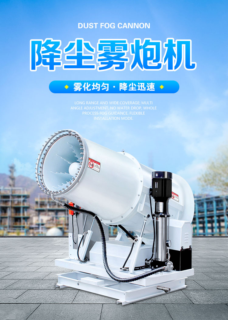 產品特點:80米降塵霧炮機射程遠、覆蓋范圍廣;多角度調節、無水珠全程霧引、安裝方式靈活多變。