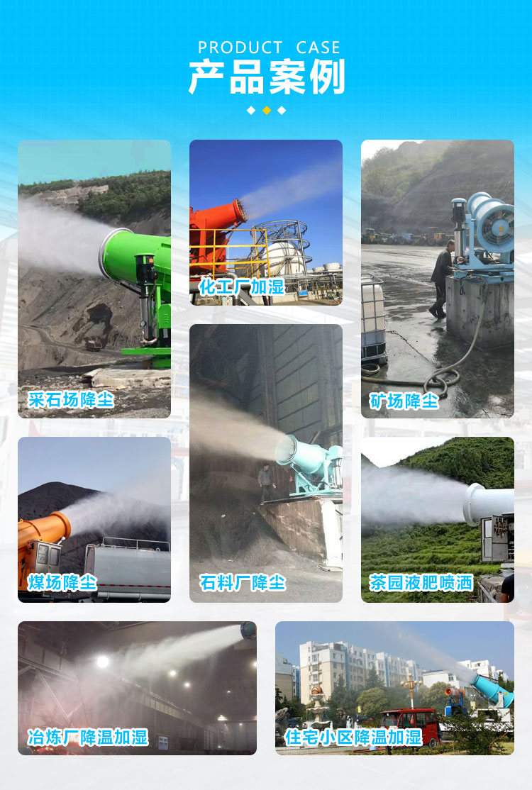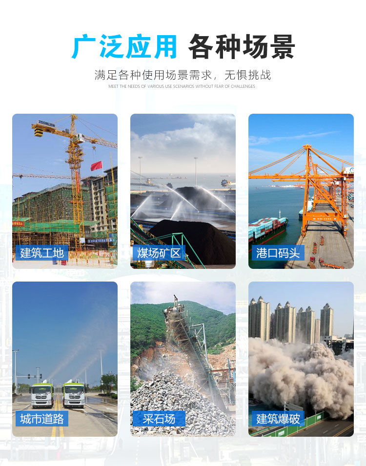主要用途:用于煤礦場、城市拆遷工地、冶金鋼鐵企業、采礦區域、煤化工企業、水泥廠、火力發電廠、物料和礦產品露天堆放廠、混凝土處理廠、垃圾堆放場、垃圾焚燒廠、沙廠、干式物料倉庫、露天爆破、重度粉塵區域。