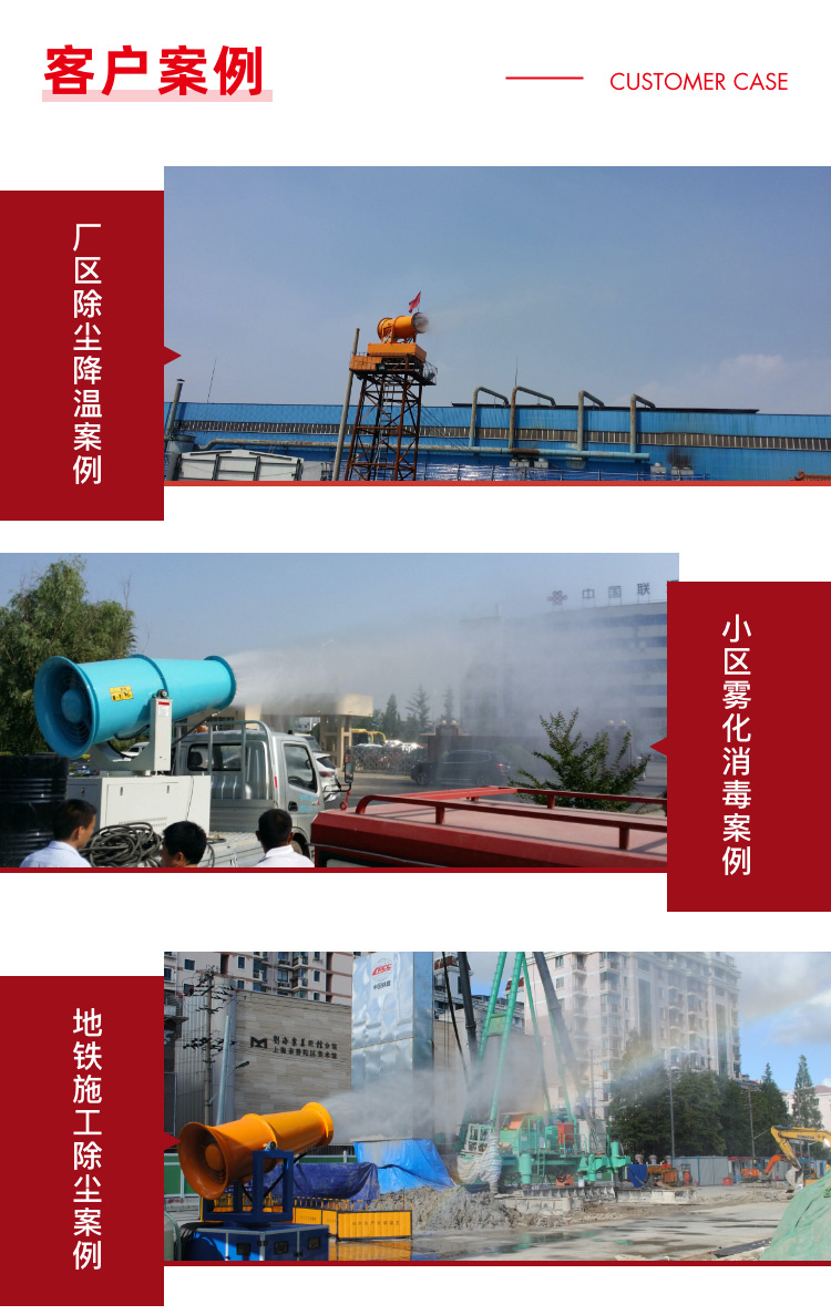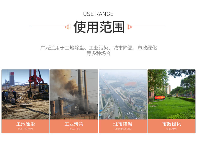主要用途:用于煤礦場、城市拆遷工地、冶金鋼鐵企業、采礦區域、煤化工企業、水泥廠、火力發電廠、物料和礦產品露天堆放廠、混凝土處理廠、垃圾堆放場、垃圾焚燒廠、沙廠、干式物料倉庫、露天爆破、重度粉塵區域。