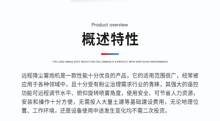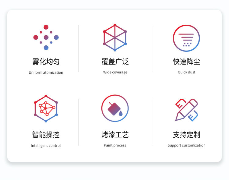 產品特點:工業降塵霧炮機霧化均勻、覆蓋范圍廣、霧化顆粒細,智能操控模式、運行平穩使用安全可靠。