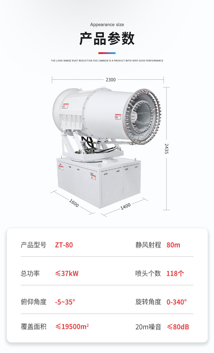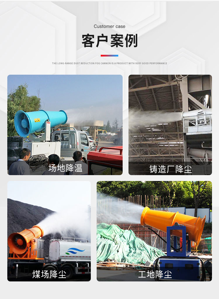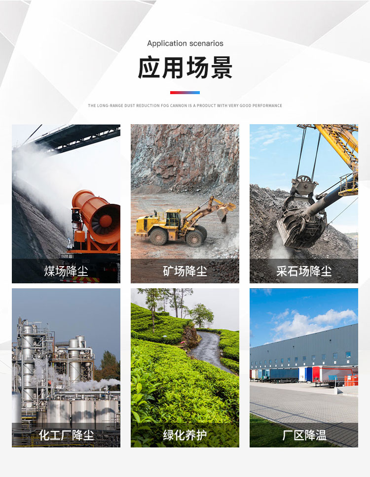主要用途:適用于城市拆遷工地、冶金鋼鐵企業、采礦區域、煤化工企業、水泥廠、火力發電廠、建筑工地、物料和礦產品露天堆放廠、混凝土處理廠、垃圾堆放場、垃圾焚燒廠、沙廠、干式物料倉庫、露天爆破、重度粉塵區域。