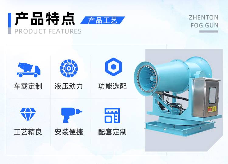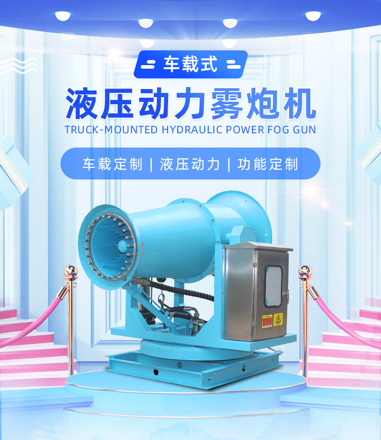 產品特點:車載式液壓霧炮機,主要為帶水箱的車載式噴霧車定制化設計,抑塵效果好,加速塵埃沉降,實現對空氣的凈化。