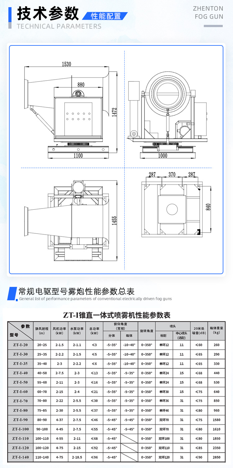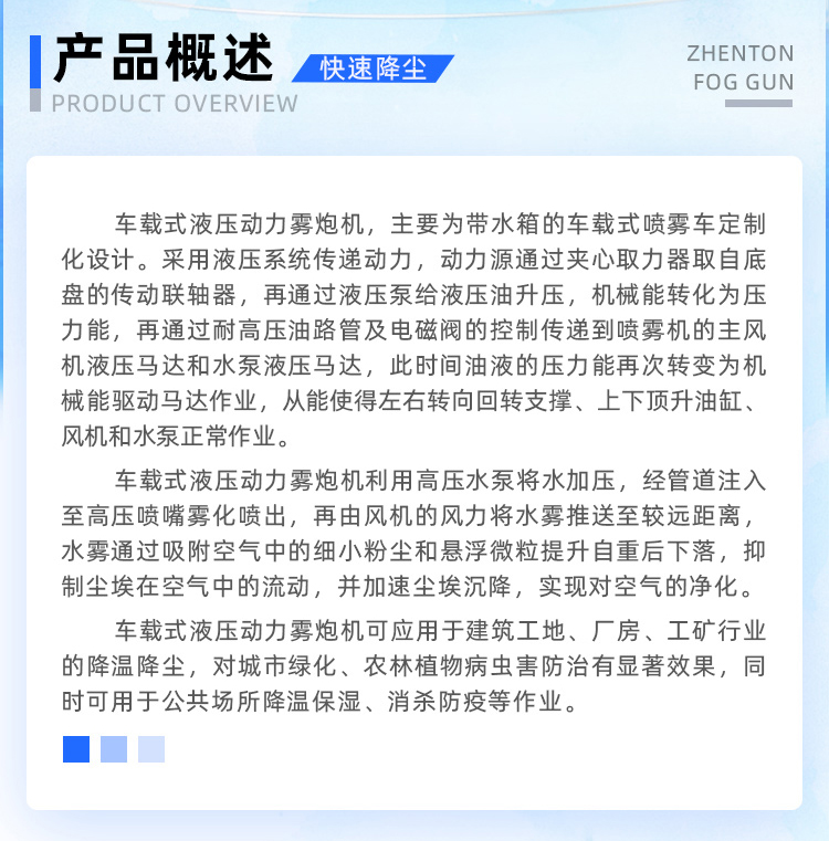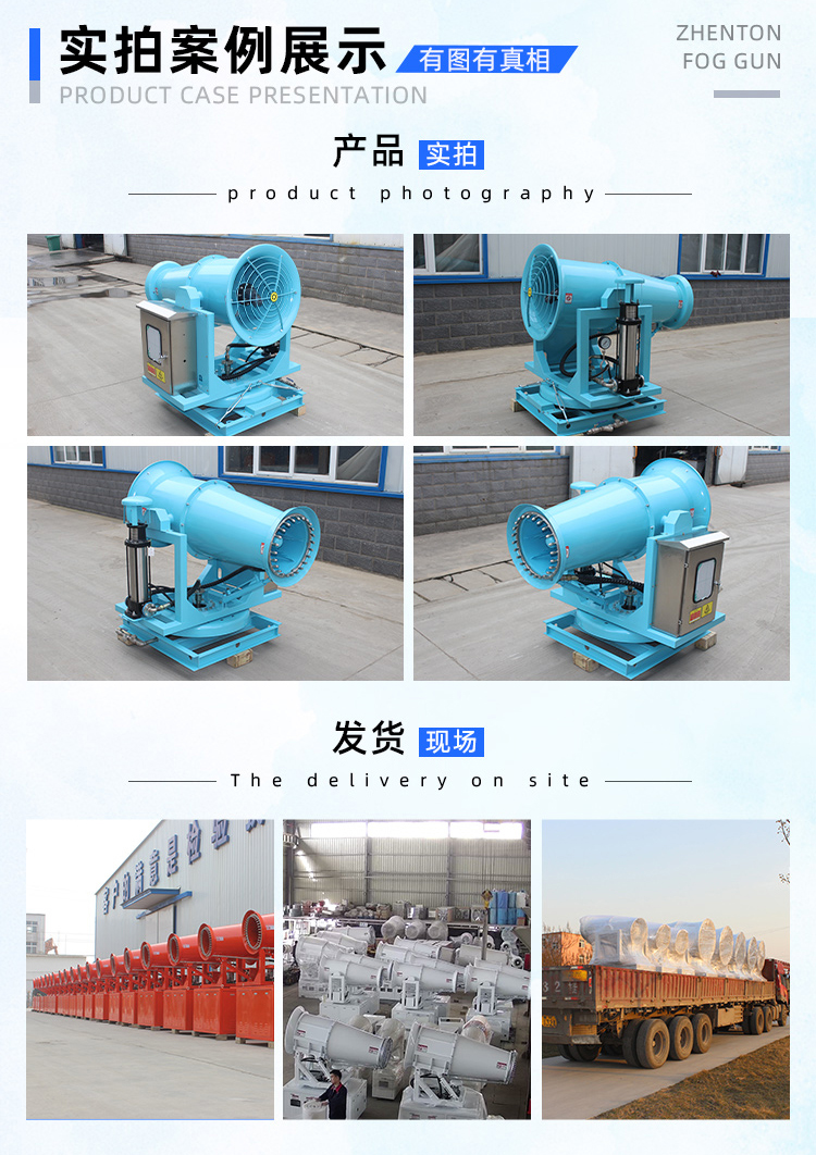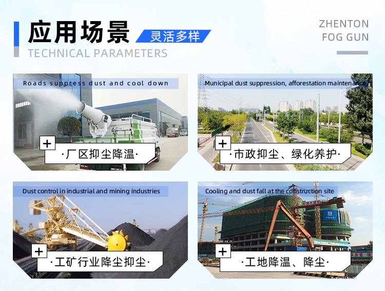 主要用途:用于煤礦場、城市拆遷工地、冶金鋼鐵企業、采礦區域、煤化工企業、水泥廠、火力發電廠、物料和礦產品露天堆放廠、混凝土處理廠、垃圾堆放場、垃圾焚燒廠、沙廠、干式物料倉庫、露天爆破、重度粉塵區域。
