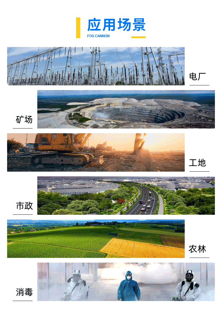 主要用途:建筑垃圾或廢渣廢料機械作業局部揚塵治理、重型車運輸中道路揚塵污染治理;飛機場、高速公路、車站、碼頭、公共場所、運動場地、炎熱場地等降塵保濕降溫消毒。