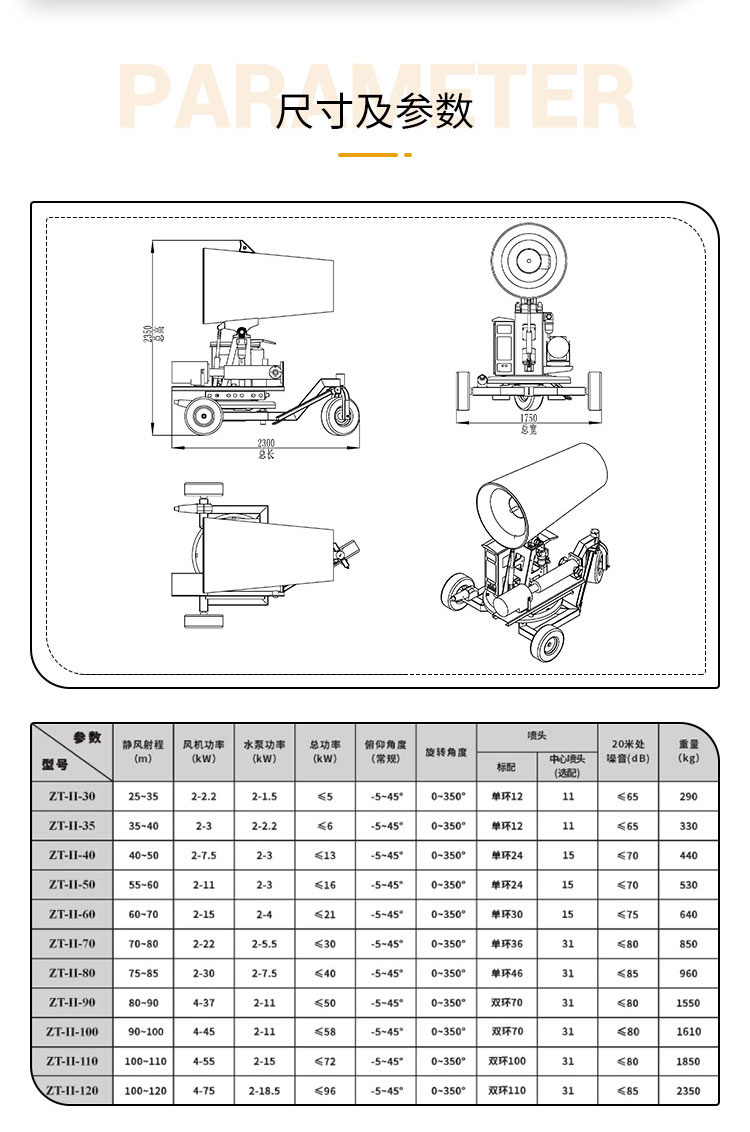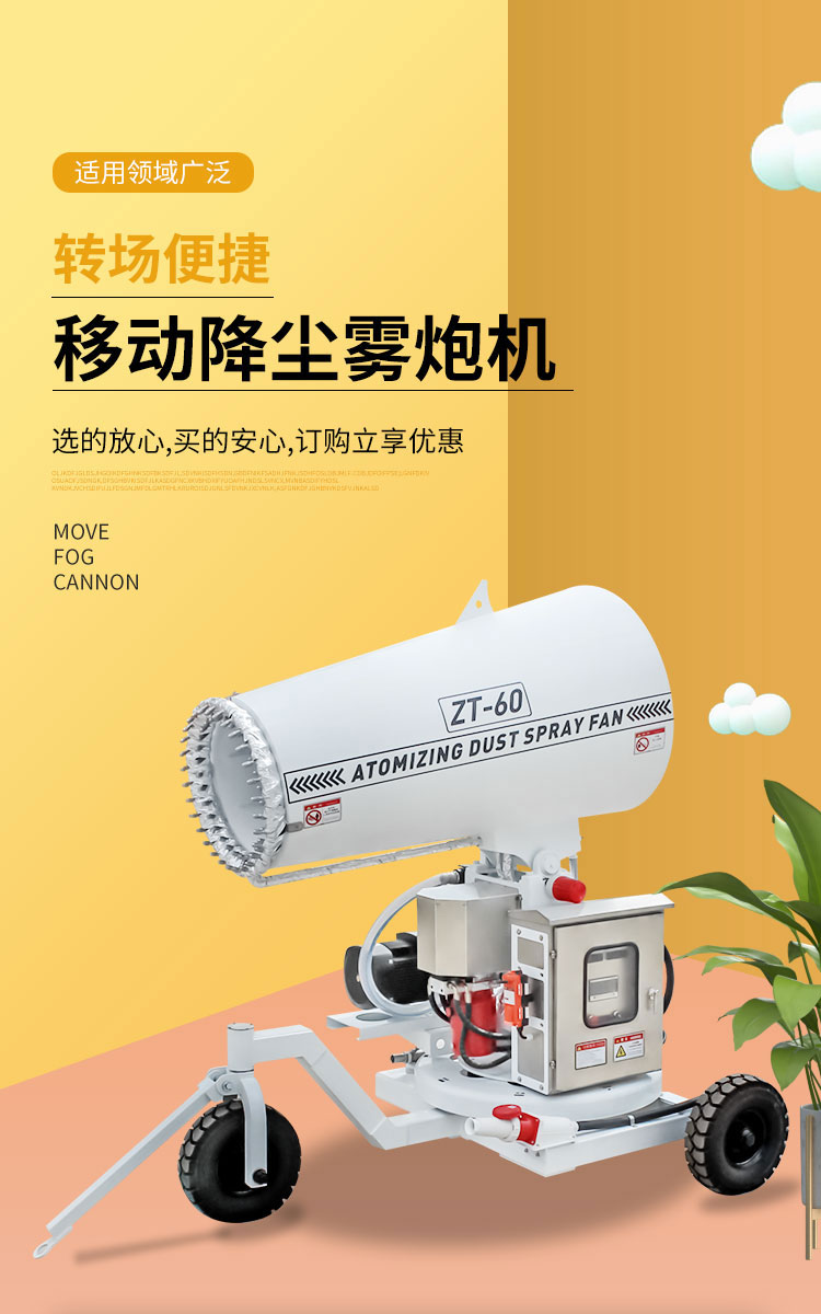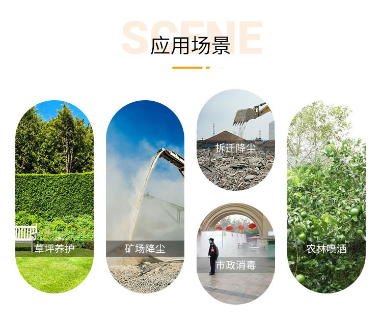 主要用途:建筑工地、煤場、電廠、焦化廠、鋼廠、工業除塵抑塵等;農業,園林綠化、飛機場、高速公路、車站、碼頭、公共場所、運動場地、炎熱場地等防疫消毒保濕降溫。