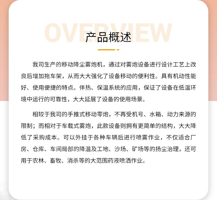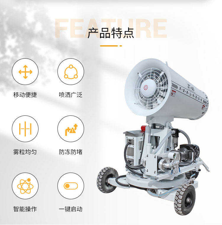 產品特點:移動降塵霧炮機具有機動性能好、使用便捷的特點。伴熱、保溫系統的應用,保證了設備在低溫環境中運行的可靠性,,大大延展了設備的使用場景。