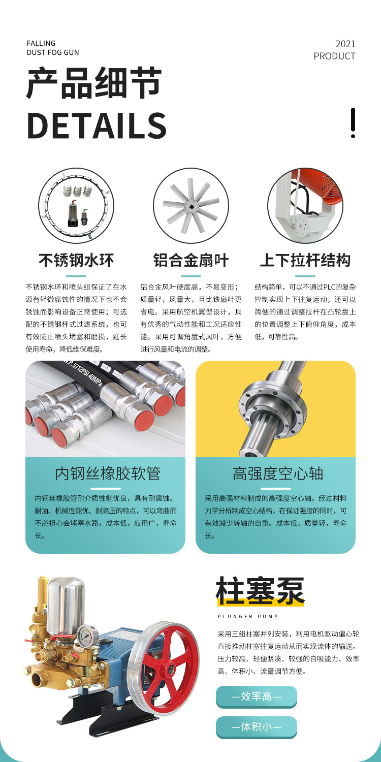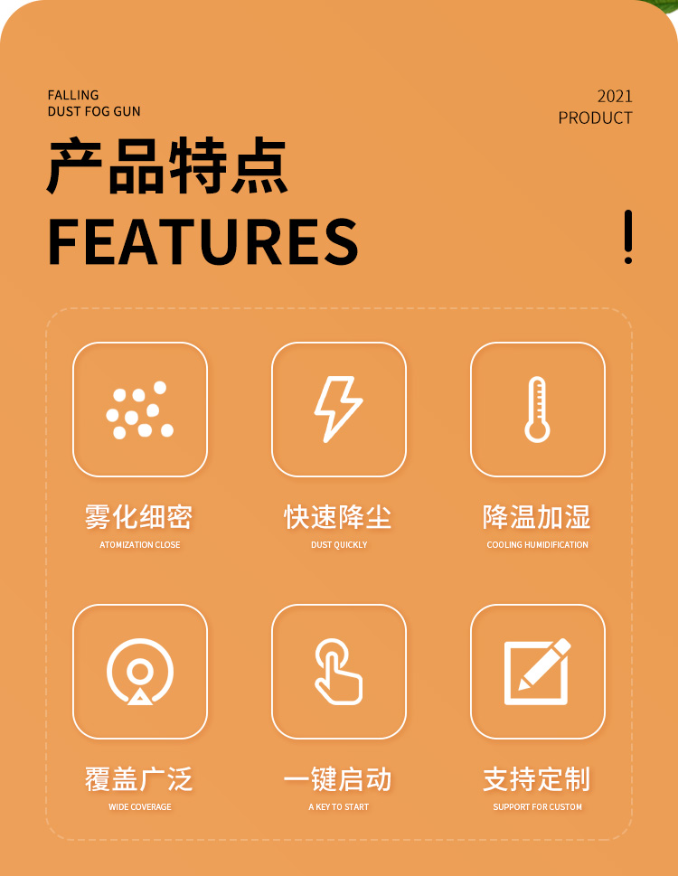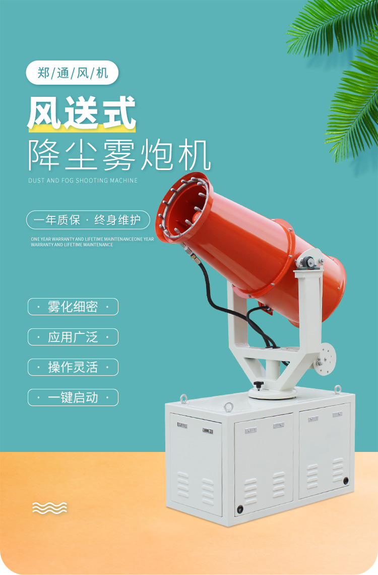 產品特點:固定式降塵霧炮機射程遠、覆蓋面積大,加速塵埃降沉,抑制塵埃擴散;控制方式靈活,啟動便捷;結構合理、運行穩定、噪音低,作業效率高。