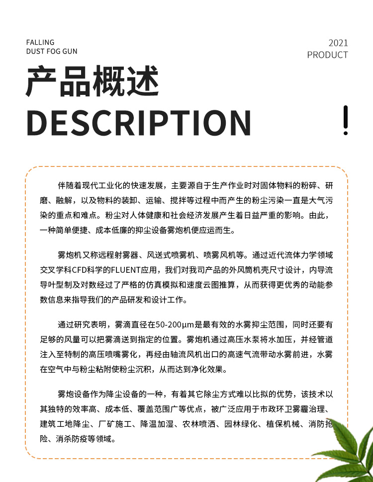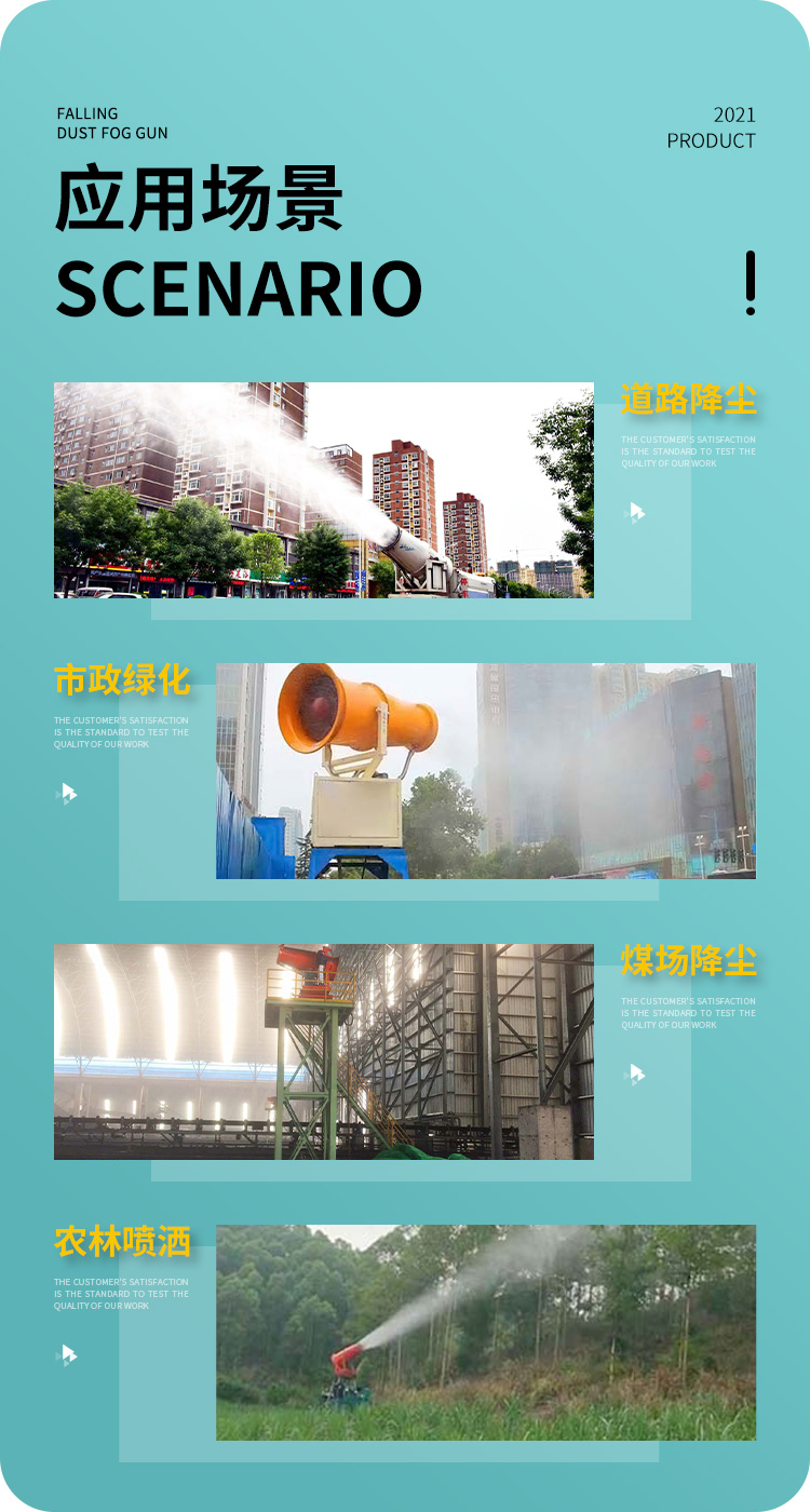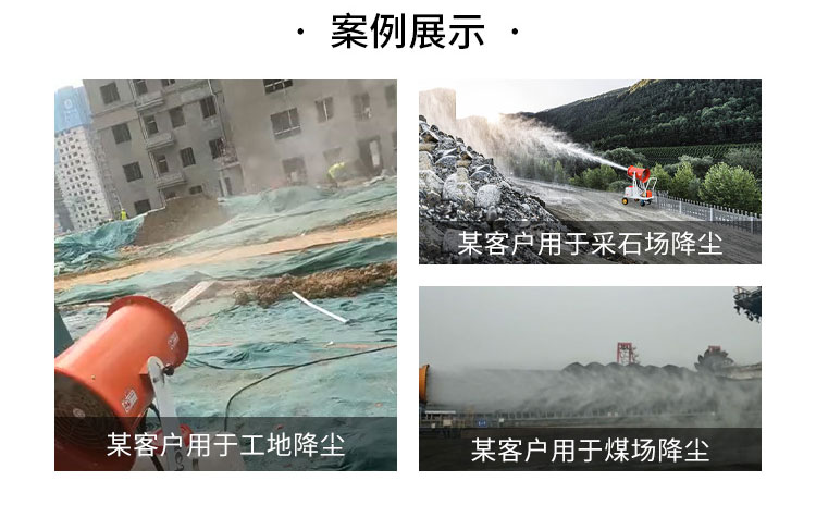 主要用途:用于煤礦場、城市拆遷工地、冶金鋼鐵企業、采礦區域、煤化工企業、水泥廠、火力發電廠、物料和礦產品露天堆放廠、混凝土處理廠、垃圾堆放場、垃圾焚燒廠、沙廠、干式物料倉庫、露天爆破、重度粉塵區域。