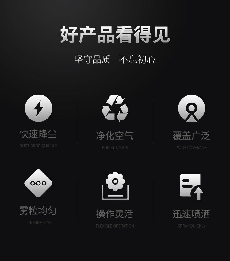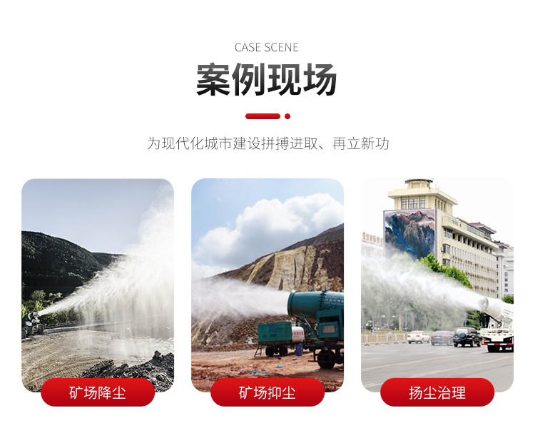 主要用途:用于城市拆遷工地、冶金鋼鐵企業(yè)、采礦區(qū)域、煤化工企業(yè)、水泥廠、火力發(fā)電廠、建筑工地、物料和礦產(chǎn)品露天堆放廠、混凝土處理廠、垃圾堆放場、垃圾焚燒廠、沙廠、干式物料倉庫、露天爆破、重度粉塵區(qū)域。