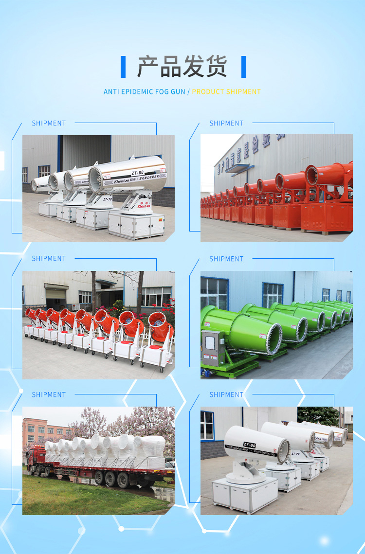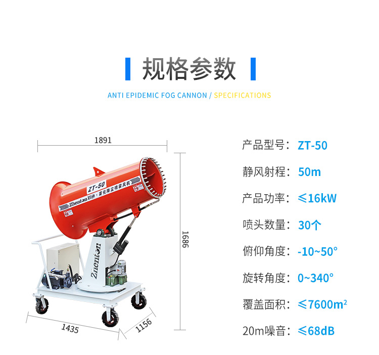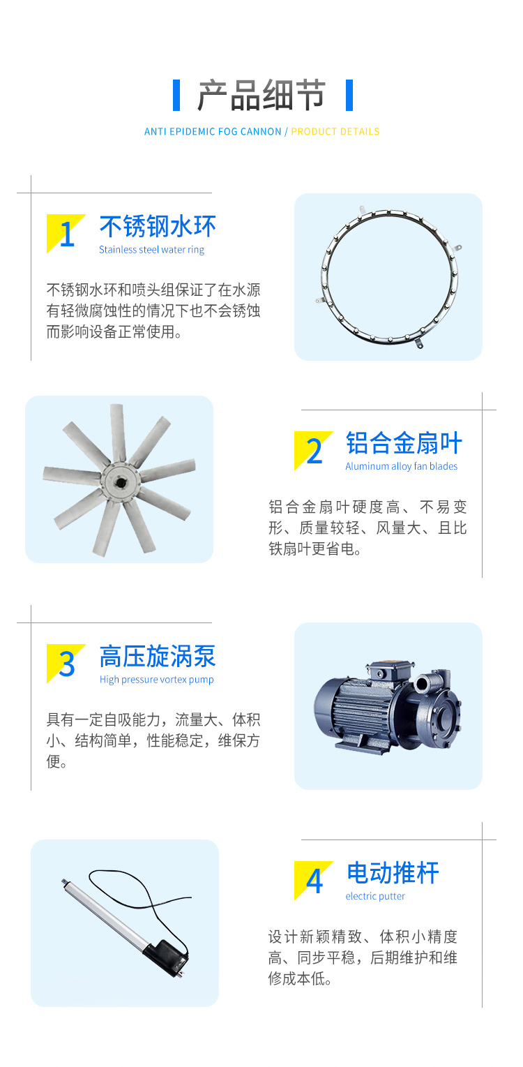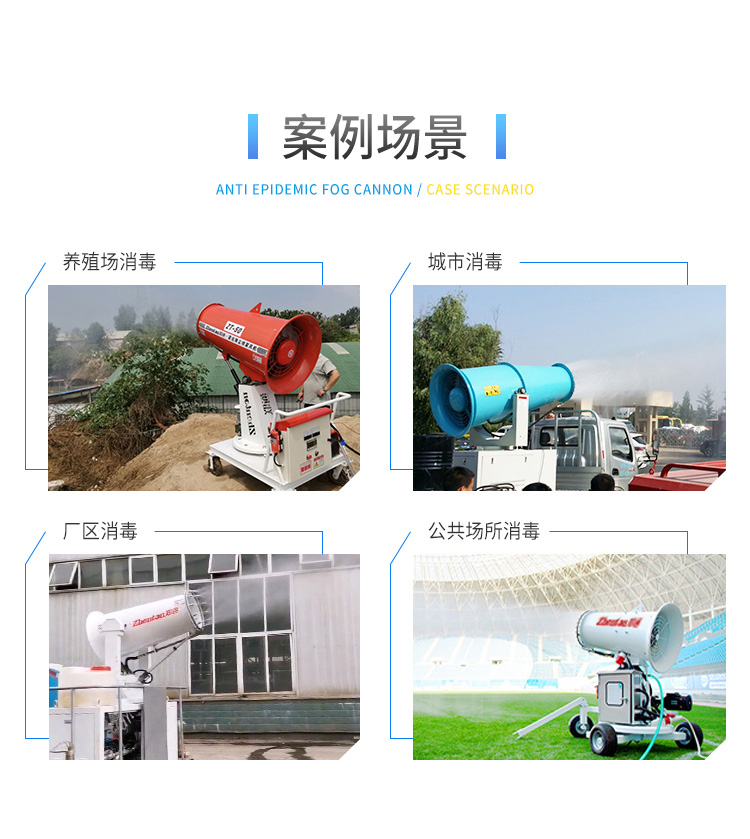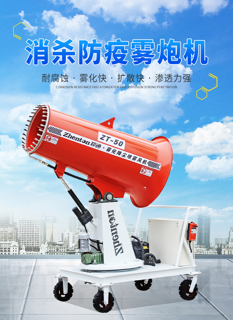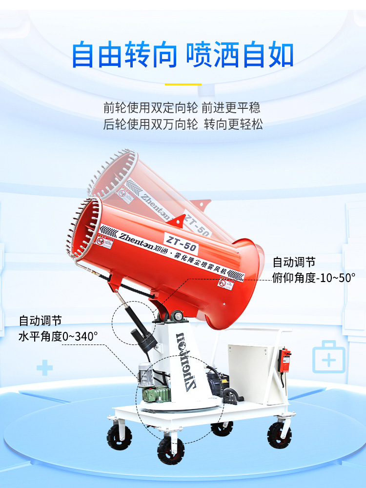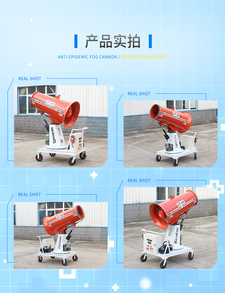 產品特點:50米防疫霧炮機具備耐腐蝕、霧化快、噴霧擴賽快等特點,前輪使用雙定向輪前進更平穩后輪使用雙萬向輪轉向更輕松。