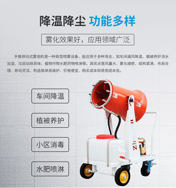 主要用途:車(chē)間通風(fēng)降溫、植被養(yǎng)護(hù)澆水加濕、垃圾站除異味、植物作物水肥藥物噴淋等。