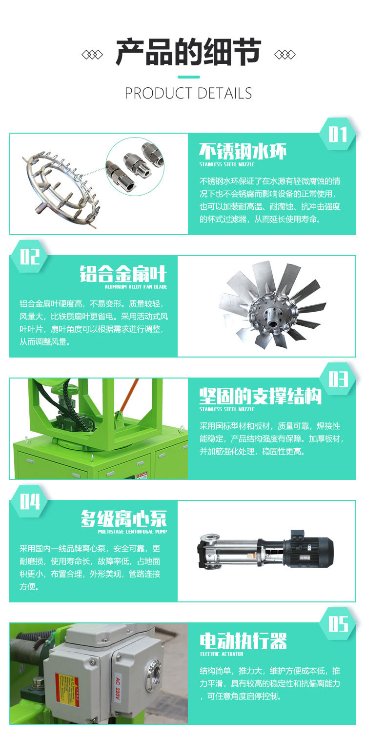 產品特點:大仰角霧炮機采用箱體式結構,安裝方便;除塵效果好,覆蓋范圍廣,工作效率高。