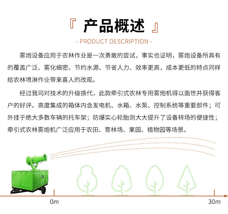 產(chǎn)品特點:牽引式農(nóng)林霧炮機耐腐蝕、防生銹,可移動式設(shè)計,打藥方便,噴灑便捷。