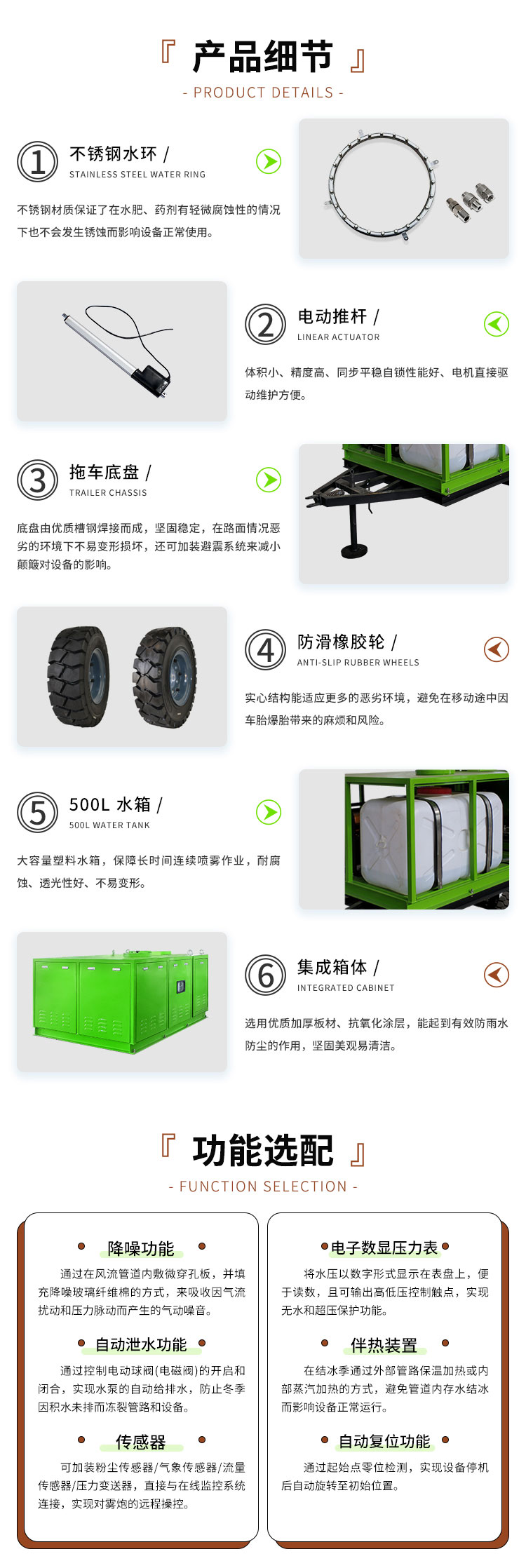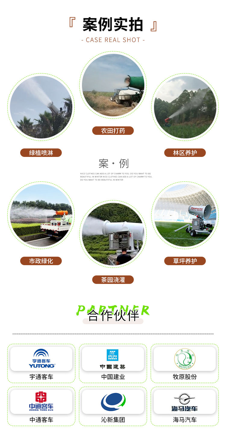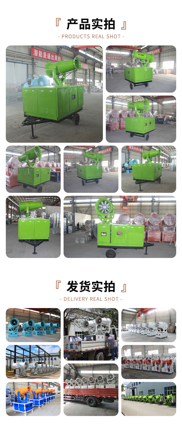 主要用途:建筑工地、煤場、電廠、焦化廠、鋼廠、工業(yè)除塵抑塵等;農(nóng)業(yè),園林綠化、飛機場、高速公路、車站、碼頭、公共場所、運動場地、炎熱場地等防疫消毒保濕降溫。