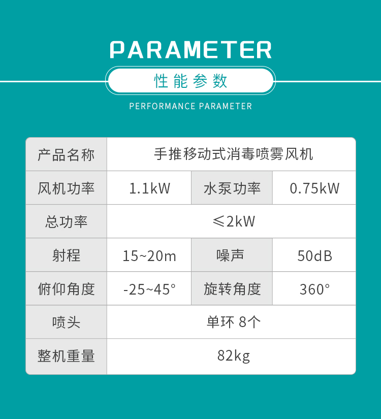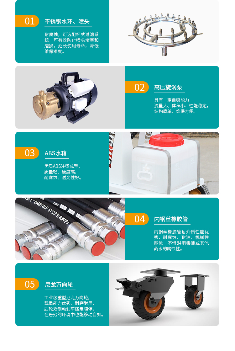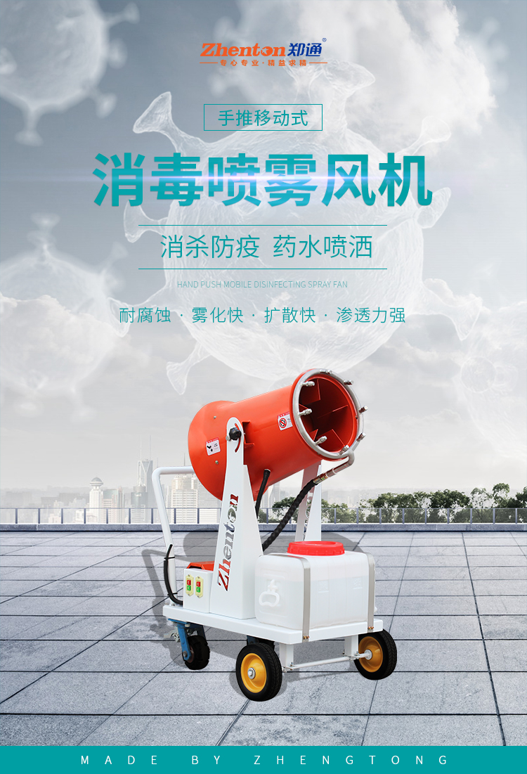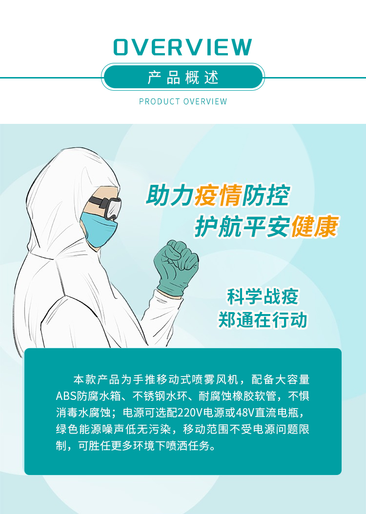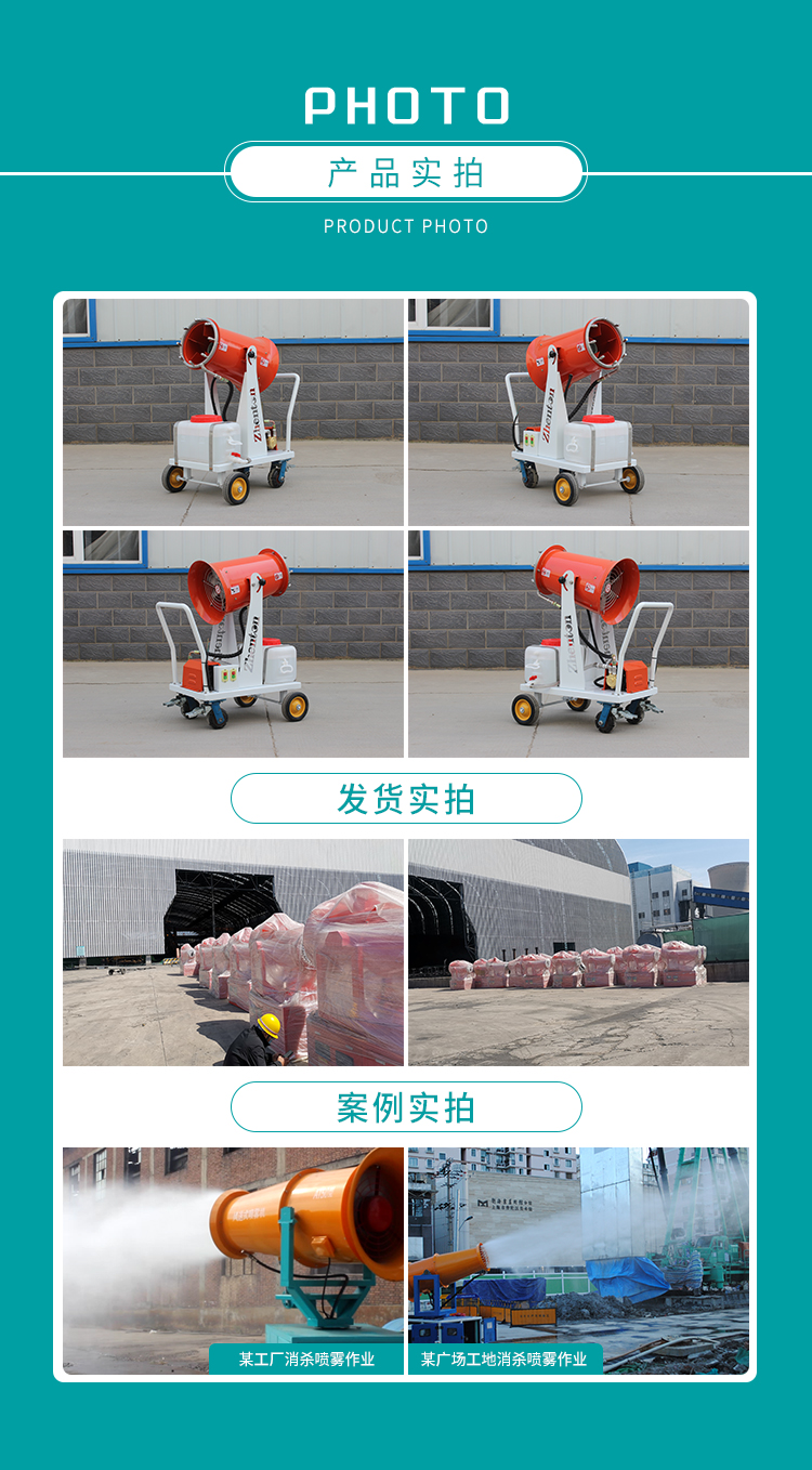 產品特點:防疫消毒霧炮機配備大容量ABS防腐水箱、不銹鋼水環、耐腐蝕橡膠軟管,不懼消毒水腐蝕;電源可選配220V電源或48V直流電瓶,綠色能源噪聲低無污染,移動范圍不受電源問題限制,可勝任更多環境下噴灑任務。