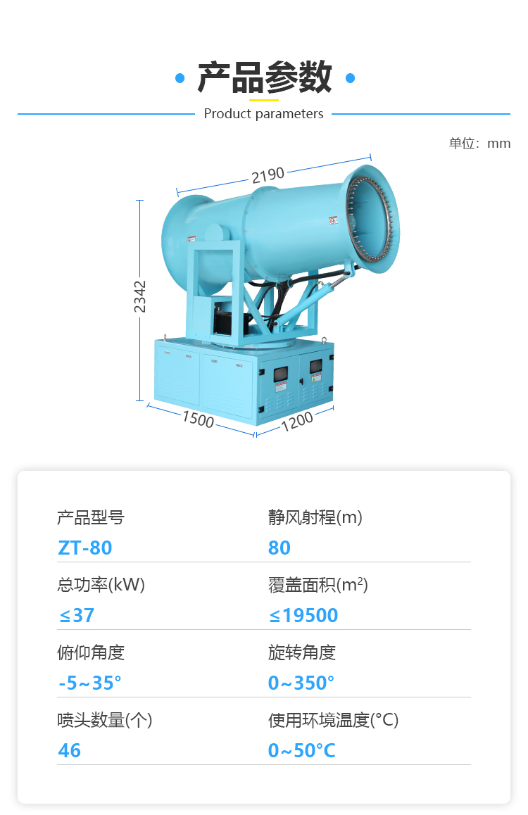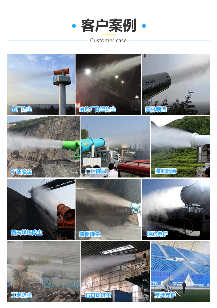 主要用途:用于城市拆遷工地、冶金鋼鐵企業(yè)、采礦區(qū)域、煤化工企業(yè)、水泥廠、火力發(fā)電廠、建筑工地、物料和礦產(chǎn)品露天堆放廠、混凝土處理廠、垃圾堆放場(chǎng)、垃圾焚燒廠、沙廠、干式物料倉(cāng)庫(kù)、露天爆破、重度粉塵區(qū)域。