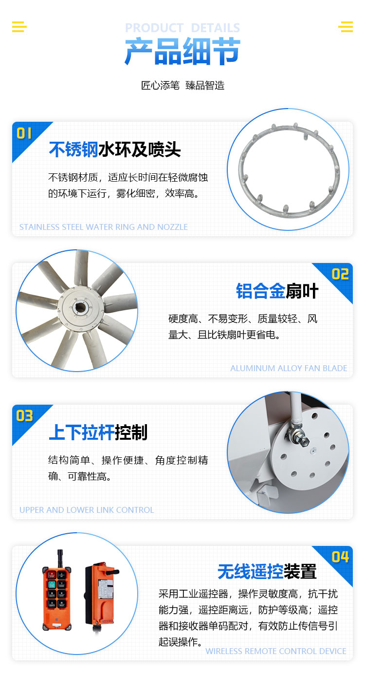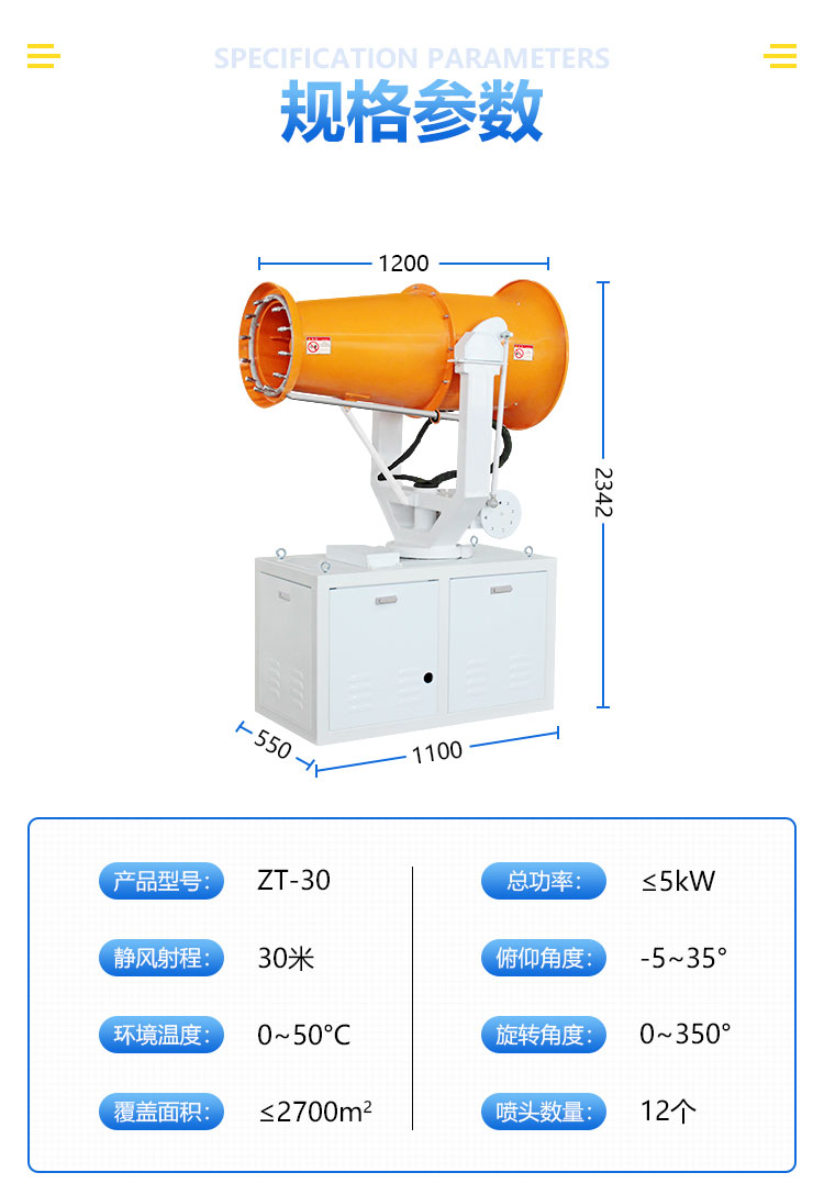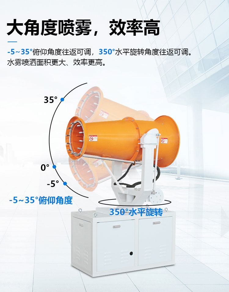 產品特點:車載式除塵霧炮機-5~35°俯仰角度往返可調,350°水平旋轉角度往返可調,水霧噴灑面積更大、效率更高。