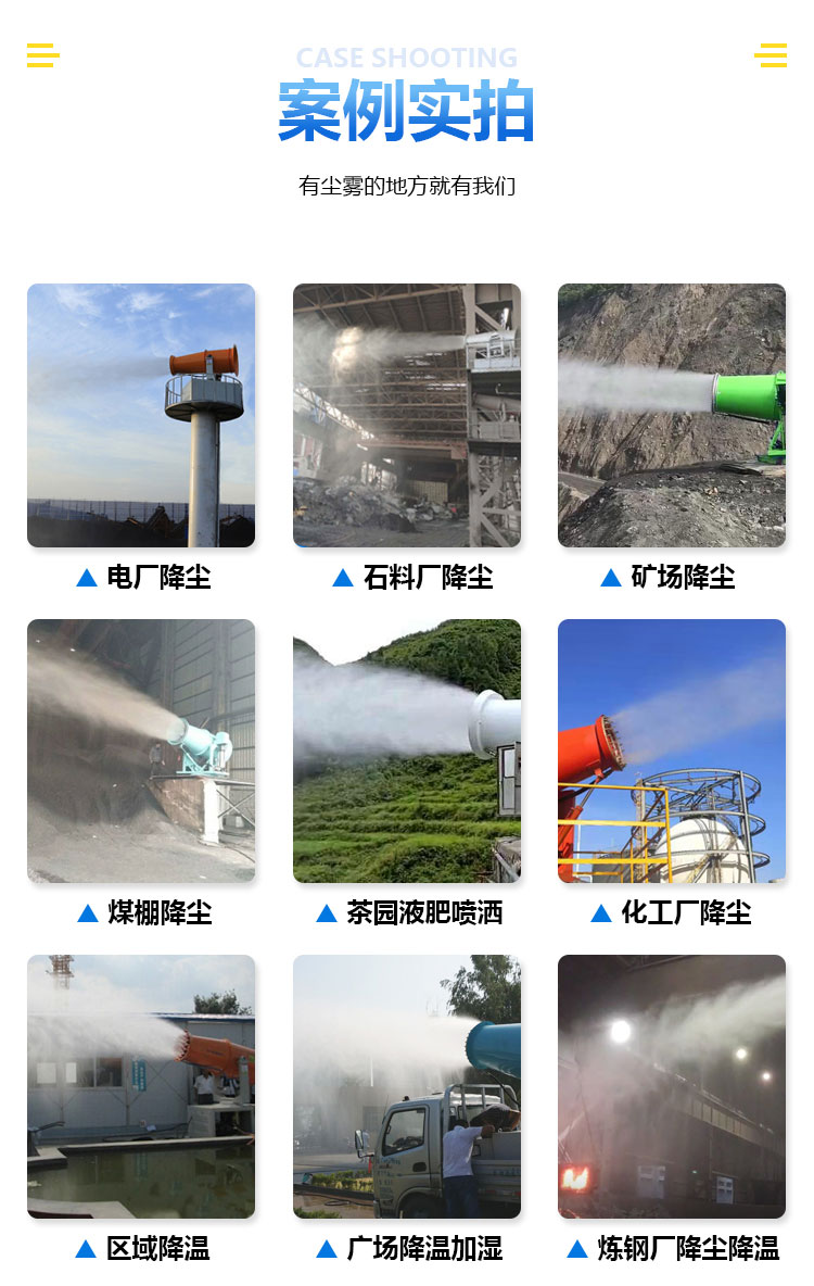 主要用途:適用于城市拆遷工地、冶金鋼鐵企業、采礦區域、煤化工企業、水泥廠、火力發電廠、建筑工地、物料和礦產品露天堆放廠、混凝土處理廠、垃圾堆放場、垃圾焚燒廠、沙廠、干式物料倉庫、露天爆破、重度粉塵區域。