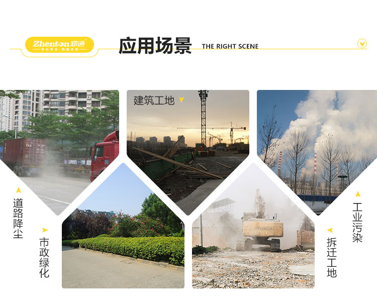主要用途:用于煤礦場、城市拆遷工地、冶金鋼鐵企業、采礦區域、煤化工企業、水泥廠、火力發電廠、物料和礦產品露天堆放廠、混凝土處理廠、垃圾堆放場、垃圾焚燒廠、沙廠、干式物料倉庫、露天爆破、重度粉塵區域。