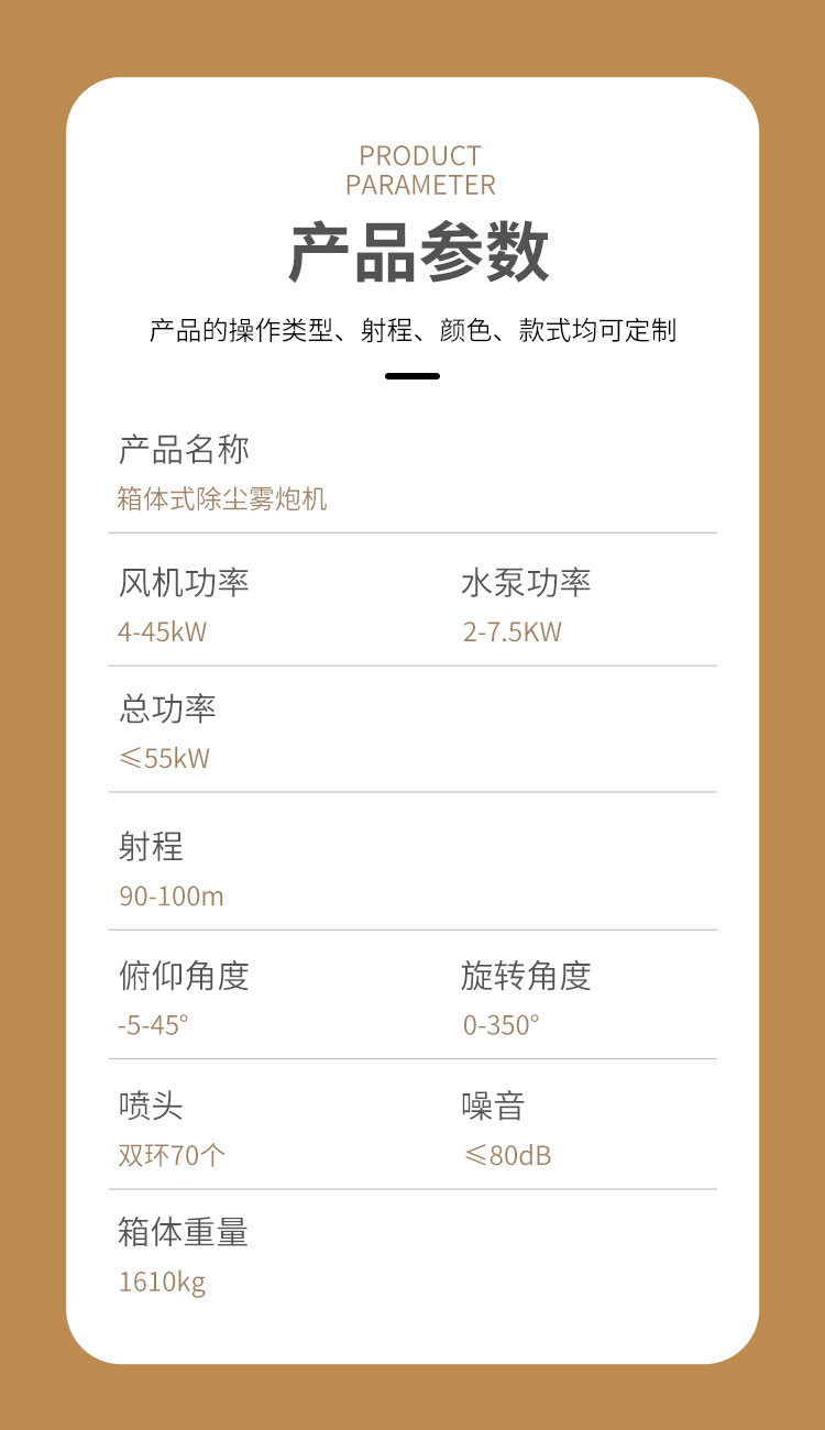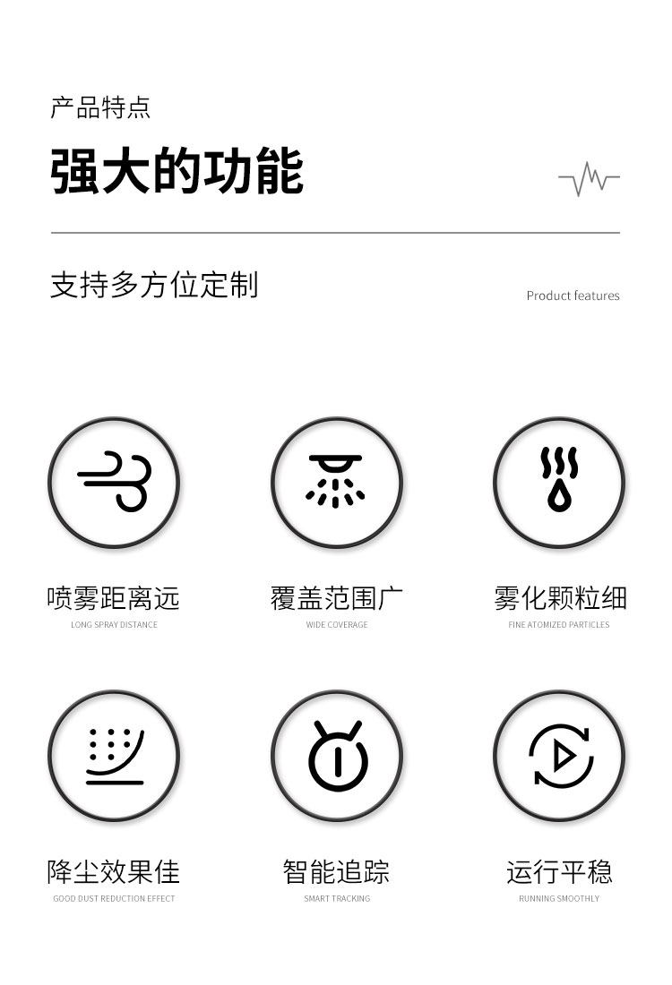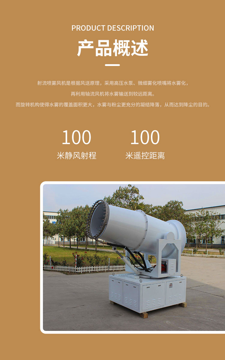 產品特點:大型除塵噴霧炮噴霧距離遠、覆蓋范圍廣、霧化顆粒細、降塵效果佳、運行平穩使用安全可靠。