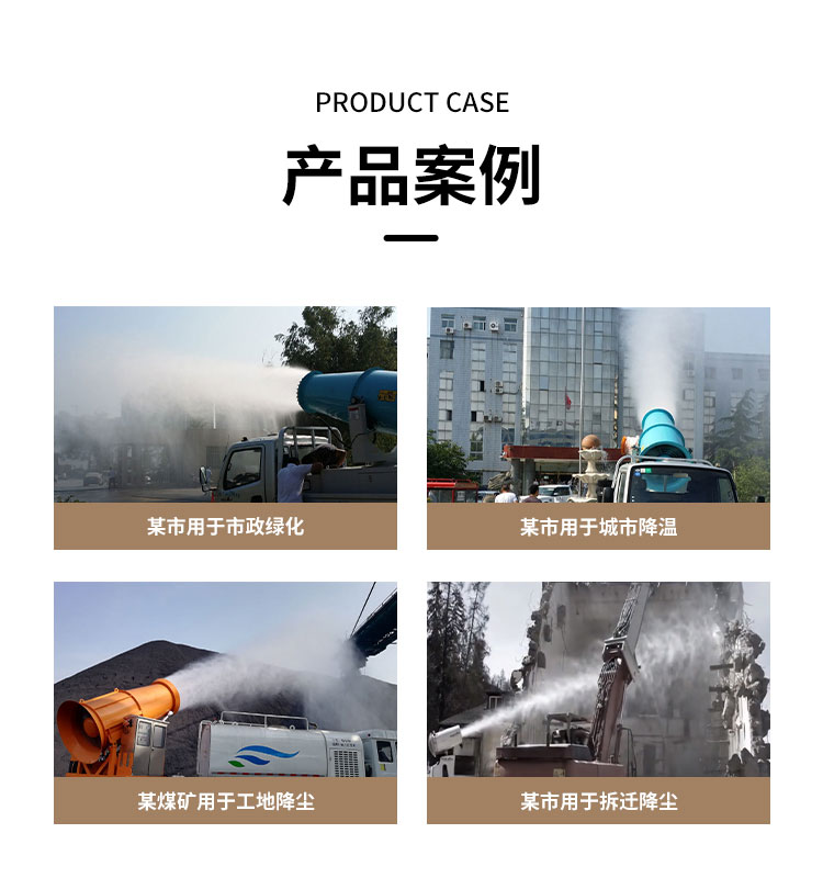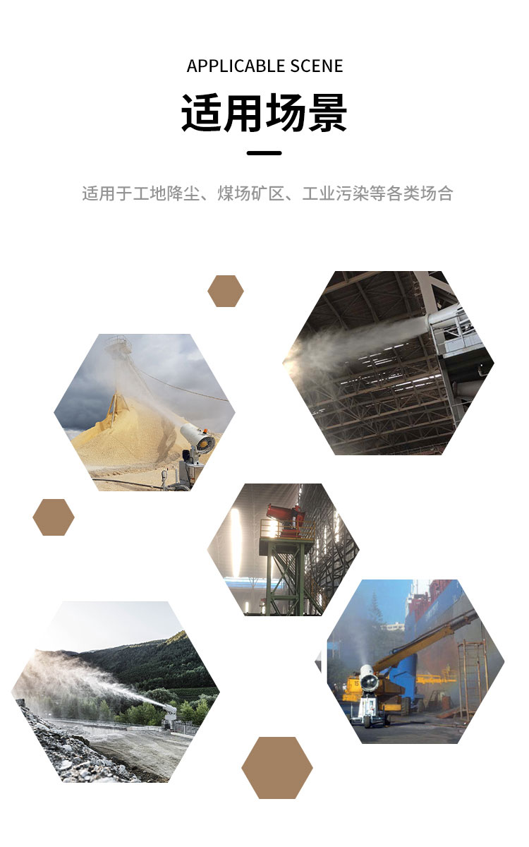 主要用途:用于煤礦場、城市拆遷工地、冶金鋼鐵企業、采礦區域、煤化工企業、水泥廠、火力發電廠、物料和礦產品露天堆放廠、混凝土處理廠、垃圾堆放場、垃圾焚燒廠、沙廠、干式物料倉庫、露天爆破、重度粉塵區域。