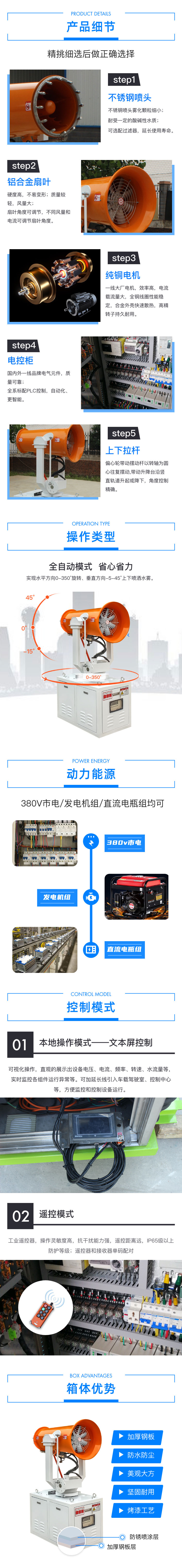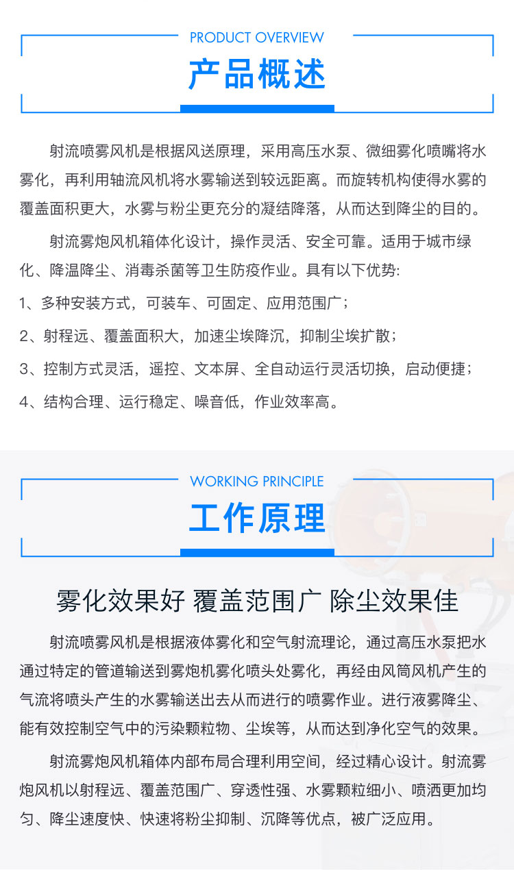 產品特點:工地射流霧炮風機射程遠、覆蓋面積大,加速塵埃降沉,抑制塵埃擴散;控制方式靈活,啟動便捷;結構合理、運行穩定、噪音低,作業效率高。