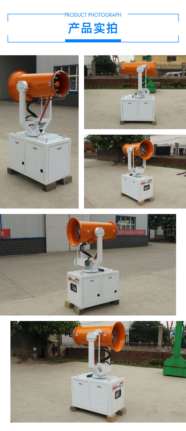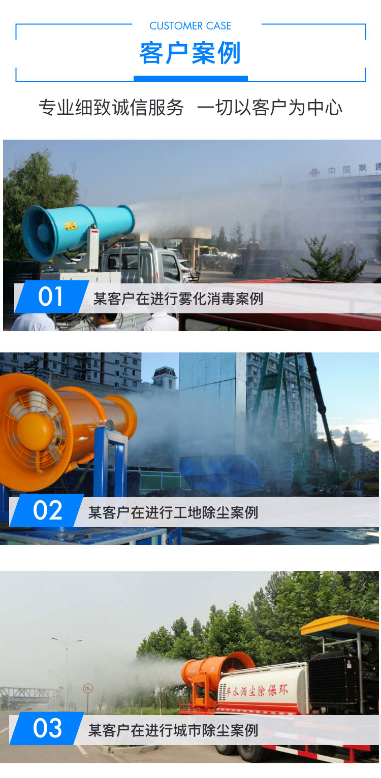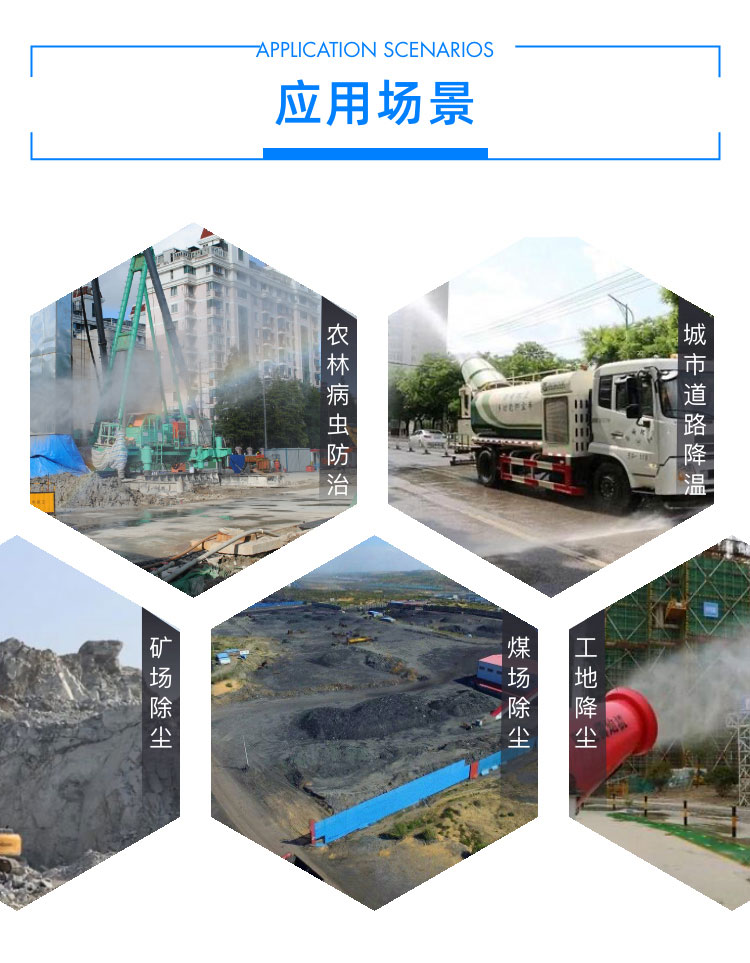 主要用途:用于煤礦場、城市拆遷工地、冶金鋼鐵企業、采礦區域、煤化工企業、水泥廠、火力發電廠、物料和礦產品露天堆放廠、混凝土處理廠、垃圾堆放場、垃圾焚燒廠、沙廠、干式物料倉庫、露天爆破、重度粉塵區域。