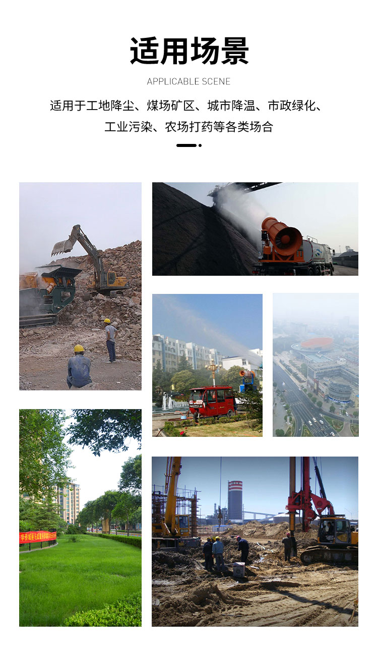 主要用途:用于煤礦場(chǎng)、城市拆遷工地、冶金鋼鐵企業(yè)、采礦區(qū)域、煤化工企業(yè)、水泥廠、火力發(fā)電廠、物料和礦產(chǎn)品露天堆放廠、混凝土處理廠、垃圾堆放場(chǎng)、垃圾焚燒廠、沙廠、干式物料倉庫、露天爆破、重度粉塵區(qū)域。