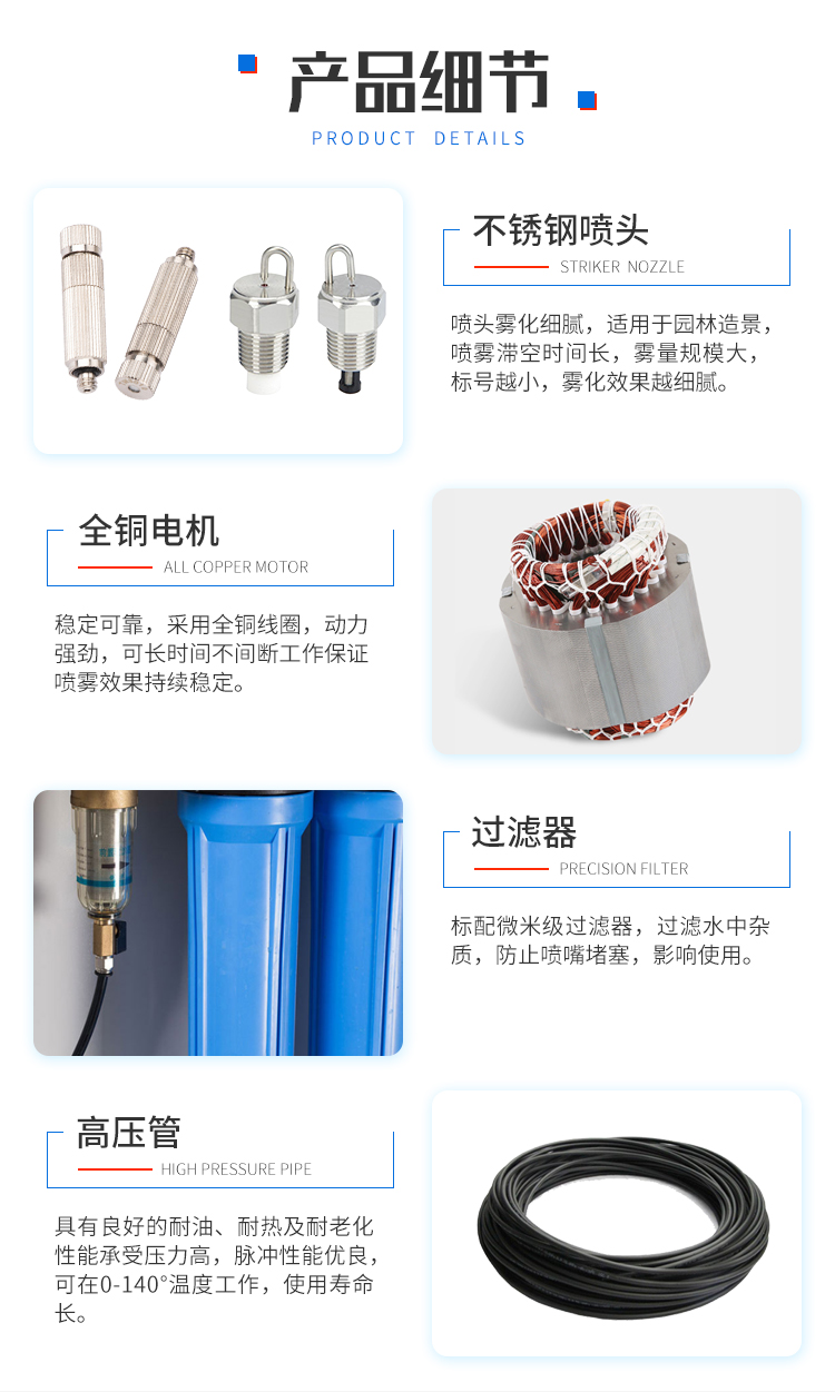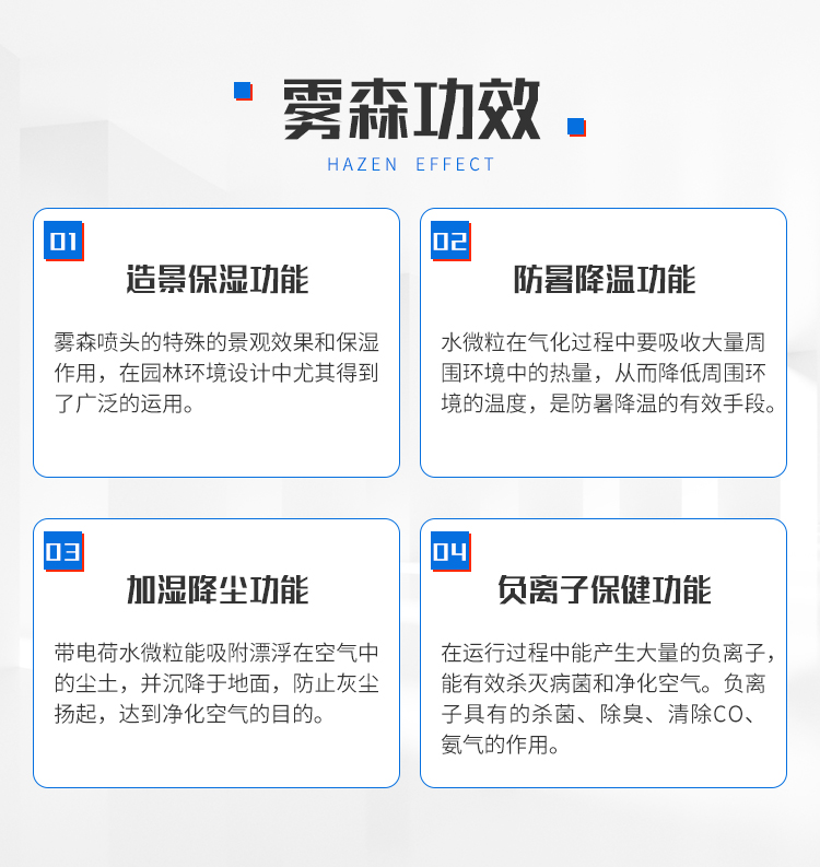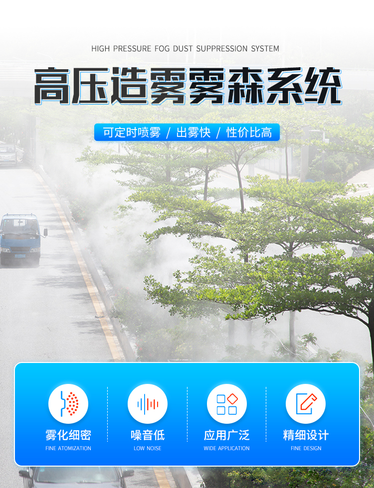 產(chǎn)品特點:霧森系統(tǒng)具有霧化細密、出霧快、加濕降塵等功能。