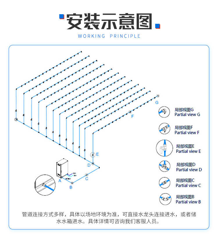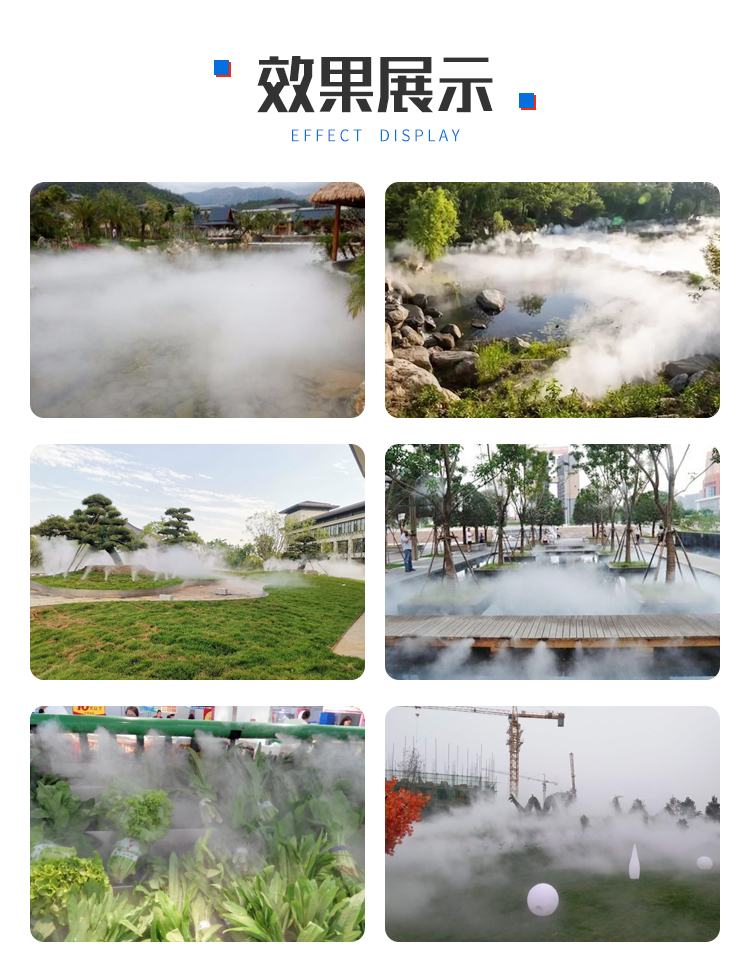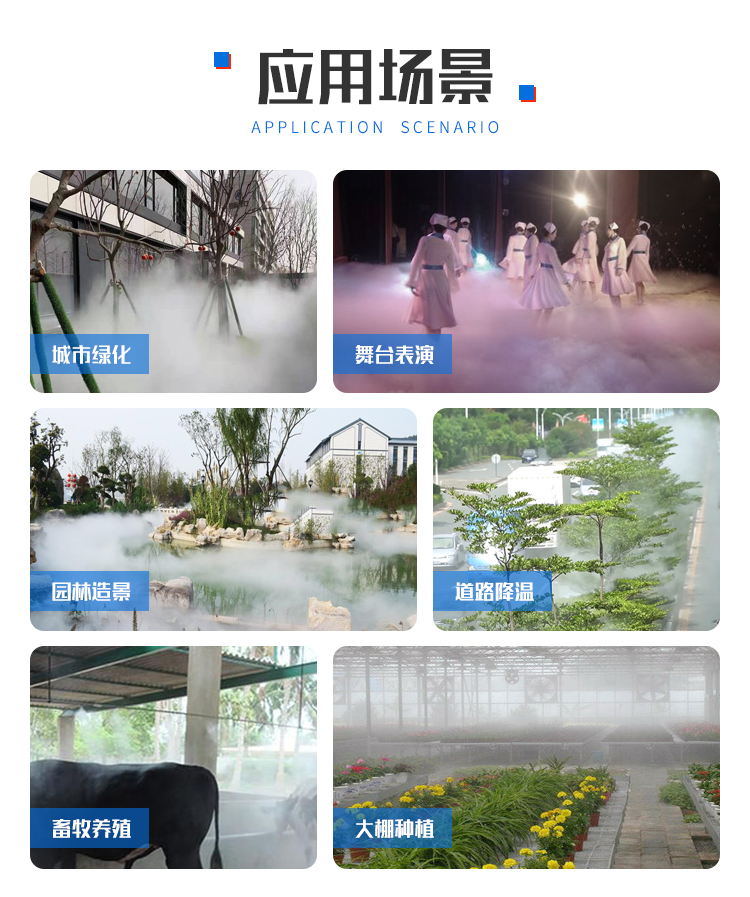 主要用途:霧森系統(tǒng)的景觀效果和保濕作用,在園林環(huán)境設(shè)計中、畜牧養(yǎng)殖、城市綠化等得到了廣泛的運用。