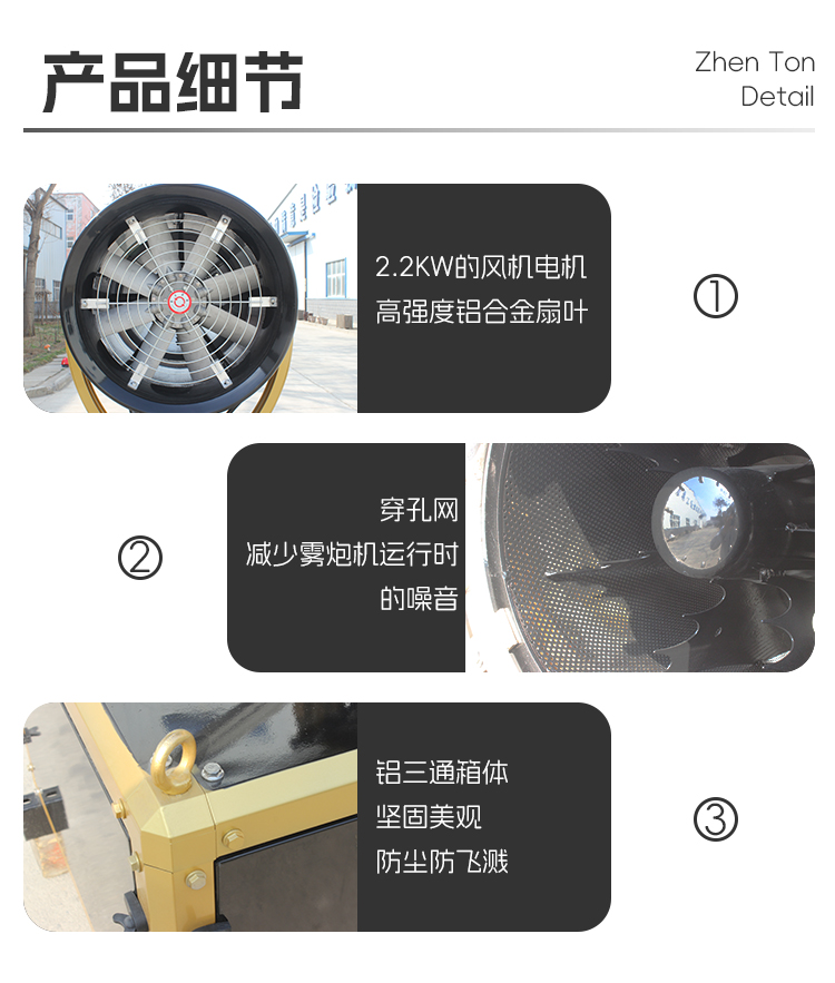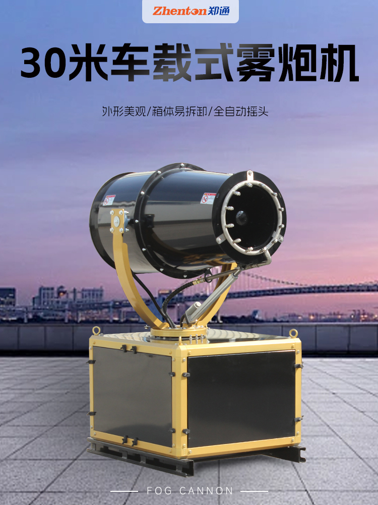 產品特點:30米車載式霧炮機外形美觀、箱體易拆卸、全自動搖頭,風筒采用穿孔板材質、噪音低、操作方便、噴霧顆粒均勻、可搭配灑水車配套使用。