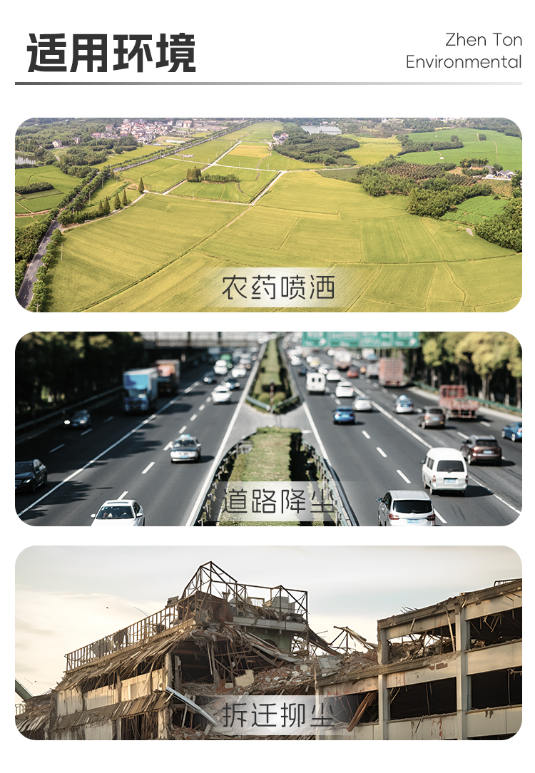 主要用途:適用于城市道路降塵、建筑工地、煤場、工業除塵、農業和園林綠化等粉塵大場所。