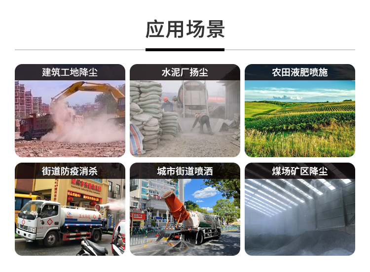 主要用途:建筑工地降塵,水泥廠揚(yáng)塵,農(nóng)田打藥,消毒噴灑,城市道路降塵降溫,煤場礦區(qū)除塵等場景降塵使用。