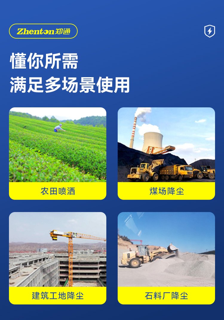 主要用途:廣泛適用于石料廠、煤場、礦山、建筑工地、農田噴灑、城市道路降塵。