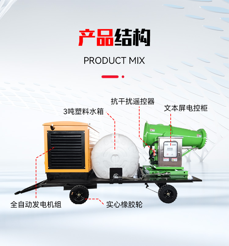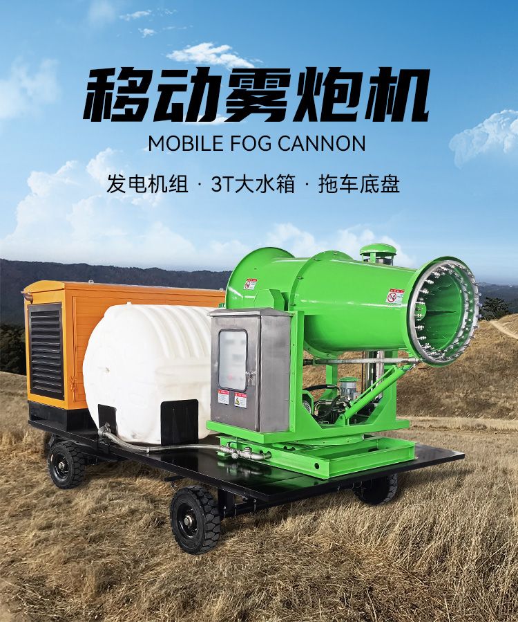 產品特點:這款50米拖車式移動霧炮機,配備有發電機組,超長續航,3噸大容量水箱,堅固耐用,平板拖車式底盤,遙控遠程和手動兩種操作方式,移動便攜,操作簡單。