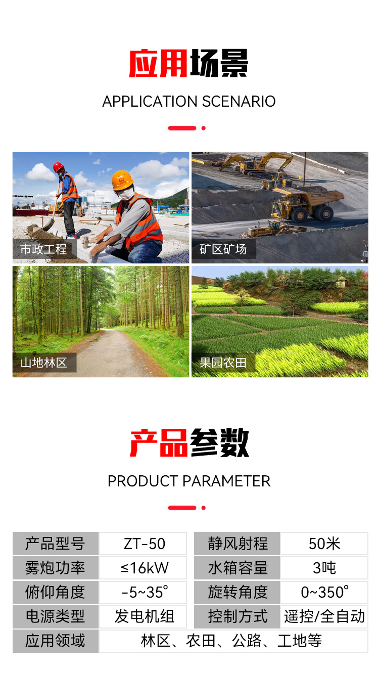 主要用途:果園農田、建筑工地、礦山開采、港口碼頭、垃圾處理場、城市公共活動等場景除塵降溫。