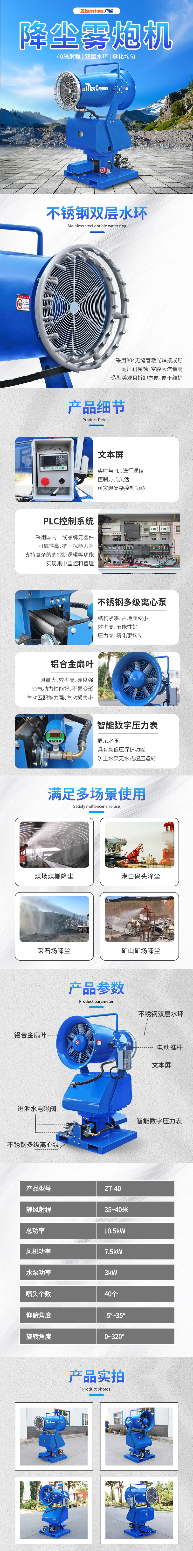 產品特點:這款奇特的ZT-40型霧炮機是鄭通霧炮機廠家新型研發的降塵噴霧設備,40米射程,雙層水環,霧化更均勻。風筒加有防護網,防治異物進入。采用304無縫管激光焊接成形,耐壓耐腐蝕,空腔大流量高,造型美觀且拆卸方便、便于維護。總功率10.5KW,搭配本地文本屏手動操作和PLC控制系統,可根據現場情況進行實時集中監控和管理。