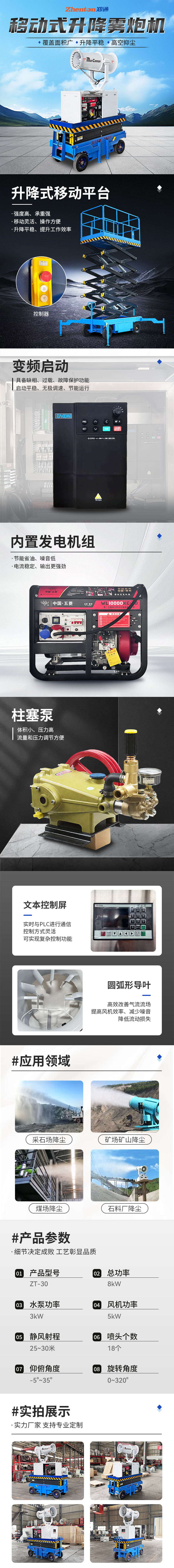 產品特點:這款移動式升降霧炮機是鄭州鄭通風機制造有限公司給客戶特殊定制,ZT-30型號,升降移動平臺,承重性強,移動靈活,噴霧范圍廣,可實現高空降塵,工作效率提高提升50%。內置五菱發電機組,節能省油,噪音低。15-150米射程,型號齊全,支持定制,有需要歡迎咨詢鄭通霧炮機生產廠家,咨詢電話徐經理:17303712093(微信同號)