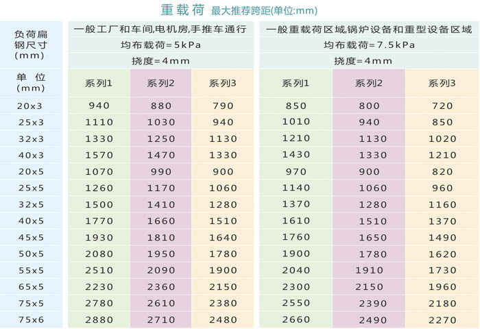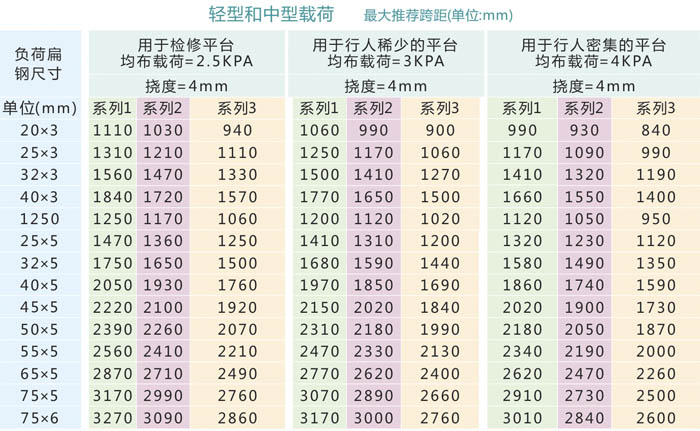 除了下表中推薦的型號(hào)外,也可設(shè)計(jì)制作其他規(guī)格的鋼格板,這要視客戶訂貨數(shù)量和交貨時(shí)間而定,詳情請(qǐng)咨詢威而特銷售工程師。不銹鋼鋼格板的荷載參數(shù)可參考碳鋼鋼格板安全載荷及撓度表。